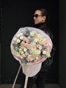 Вишуканий та об'ємний букет, головним акцентом якого є елітні піоновидні троянди сорту White O’Hara, відомі своїм тонким ароматом та пишними багатошаровими пелюстками. Композицію гармонійно доповнюють білі кулясті хризантеми, тендітна еустома та гілочки сизого евкаліпту. Багатошарове пакування у ніжних пастельних тонах підкреслює статусність та преміальність цього подарунка. Така масштабна робота ідеально підійде для ювілею, весілля або як особливий жест уваги для коханої людини. Якщо ви прагнете справити незабутнє враження, варто купити квіти саме у такому професійному оформленні. Наші флористи використовують лише найсвіжіші квіти, щоб вони тривалий час зберігали свій первісний вигляд. Наша швидка доставка квітів дозволить вам замовити букет і бути впевненими у бездоганному сервісі та вчасному врученні подарунка.