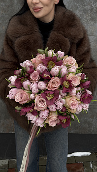 Вишуканий та глибокий за колористикою букет, що поєднує в собі аристократичні відтінки та розмаїття текстур. Основу композиції складають сортові піоновидні тюльпани Allison Bradley та витончені троянди Memory Lane з їхнім характерним попелясто-рожевим кольором. Особливого шарму додають пишні гвоздики відтінку лаванди та дрібні суцвіття рожевої скімії, що створюють ефектний об'єм. Весь ансамбль оформлений у фірмове пакування з логотипом, що підкреслює преміальність подарунка. Така авторська робота стане ідеальним вибором для особливої події, ювілею або як вишуканий комплімент для людини з тонким смаком. Якщо ви бажаєте замовити букет, який виглядає дорого та стильно, ця композиція створена для вас. Ми використовуємо лише свіжі квіти, щоб вони тривалий час зберігали свою красу та аромат. Наша професійна доставка квітів працює оперативно, щоб ви могли купити квіти та подарувати незабутні емоції вчасно.