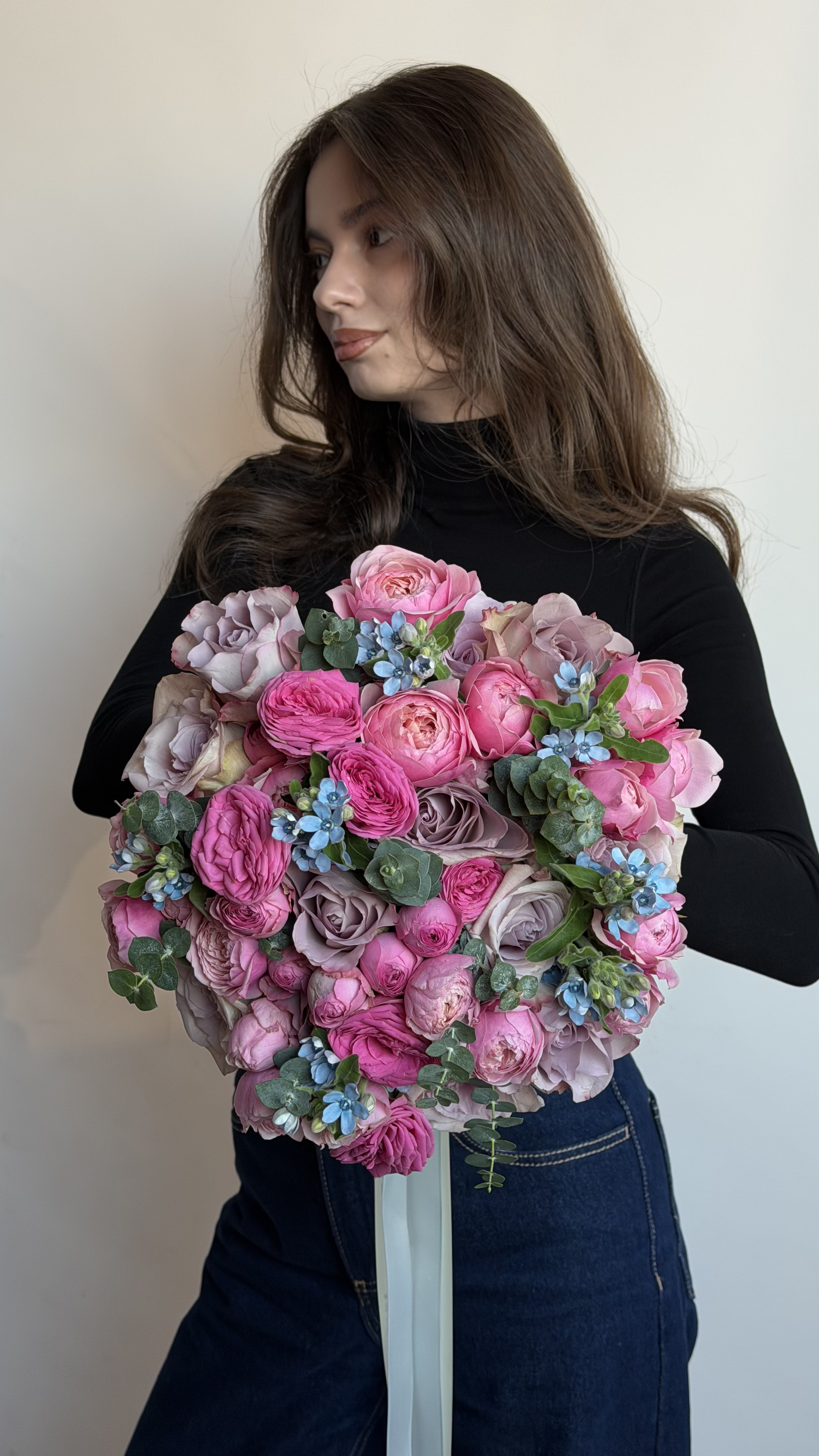 Вишуканий та багатошаровий букет, що поєднує в собі преміальні піоноподібні троянди різних сортів: від насиченого малинового до ніжного пудрово-лавандового відтінку. Особливого шарму композиції додають дрібні блакитні квіти оксипеталуму, які створюють небесний акцент, та ароматні гілочки евкаліпту зі сріблястим відливом. Букет зібраний у щільну круглу форму та прикрашений довгими світлими стрічками.