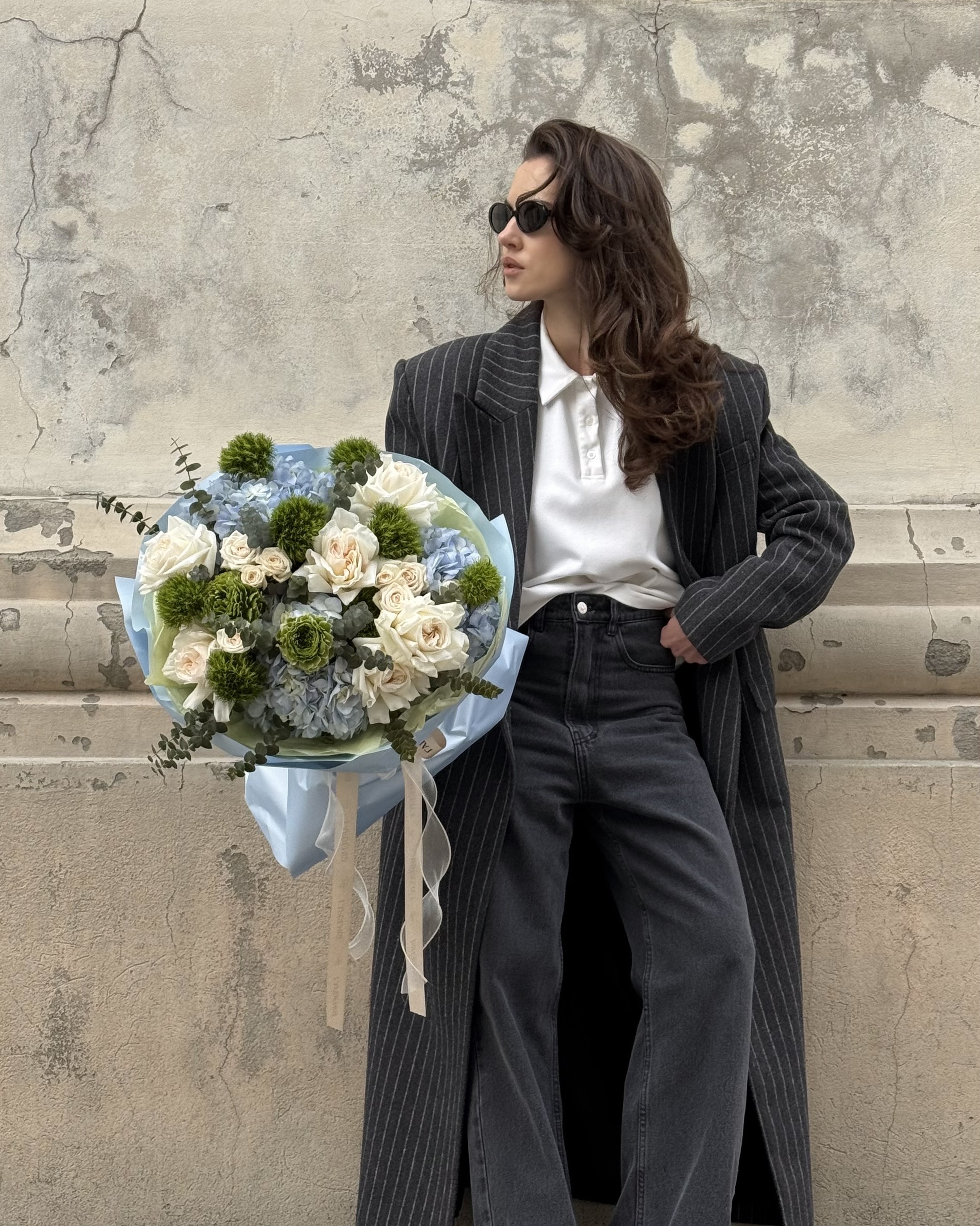 Цей розкішний та об'ємний букет поєднує в собі ніжність блакитної гортензії, класичну красу білих троянд та унікальні акценти фактурної зеленої гвоздики і евкаліпту. Композиція оформлена у стильне багатошарове пакування небесного відтінку, що підкреслює її свіжість та вишуканість. Такий подарунок ідеально підійде для коханої дівчини, дружини або мами на день народження, річницю чи як особливий жест уваги. Якщо ви шукаєте спосіб висловити щирі почуття, варто замовити букет, який поєднує в собі сучасний стиль та природну гармонію. Наші свіжі квіти довго тішитимуть одержувача своєю красою, а професійна доставка квітів гарантує, що ваш сюрприз прибуде вчасно та у найкращому вигляді.
