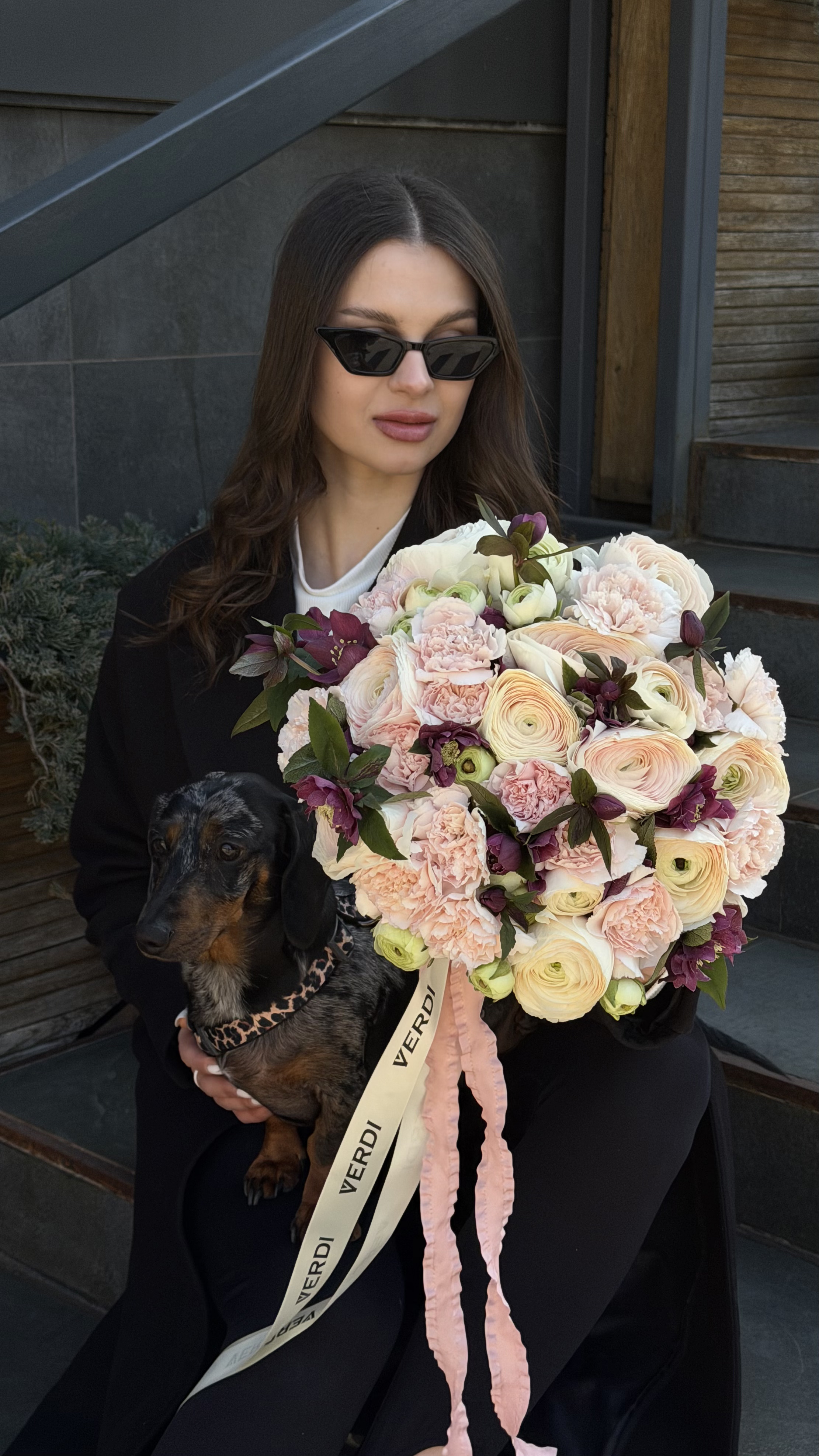 Ця вишукана композиція вражає своєю багатошаровістю та ніжним поєднанням пастельних відтінків. До складу букета входять розкішні кремові ранункулюси, пухнасті персикові гвоздики та глибокі акценти темного морозника (хелеборуса), що додають квітковому ансамблю особливого стилю. Декор у вигляді ніжної рожевої рюші та брендованої стрічки завершує цей елегантний образ. Такий букет стане бездоганним вибором для особливої події: ювілею, весілля або як романтичний жест для коханої людини. Якщо ви бажаєте замовити букет, який підкреслить ваш витончений смак, ця композиція — саме те, що треба. Ми пропонуємо тільки свіжі квіти, а наша професійна доставка квітів подбає про те, щоб ваш сюрприз був доставлений вчасно та у найкращому вигляді. Купити квіти преміальної якості тепер простіше, ніж будь-коли.