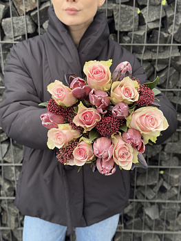 Відкрийте для себе чарівну красу наших букетів. Ця приголомшлива композиція створює елегантність тюльпанів, ніжну романтику рожевих трояндів та унікальну текстуру шкіри, створюючи гармонійний баланс кольору та шарму. Ідеальний для будь-якої події, цей букет додає нотку вишуканості до вашого дня!