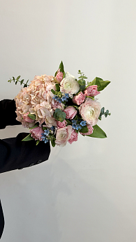 Повітряний та вишуканий букет у пастельних відтінках, що поєднує об’ємні суцвіття ніжно-рожевої гортензії, елегантні ранункулюси та тендітні рожеві тюльпани. Особливого шарму композиції додають дрібні блакитні квіти оксипеталуму, які створюють ледь помітний, але стильний колірний акцент. Декоративні гілочки евкаліпту завершують образ, додаючи букету природної динаміки та легкості.