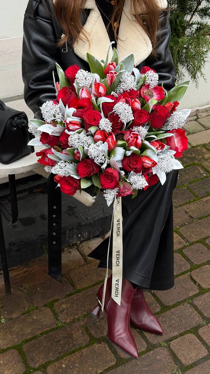 Відкрийте для себе чарівність нашого вишуканого букета з троянда Rodo, білосніжних тюльпанів, анемона Mistral Red та скімії. Ця елегантна композиція створює позачасову красу з сучасним відтінком, що робить її ідеальним подарунком для будь-якої події. Її насичені текстури та яскраві кольори створюють гармонійну композицію, яка зберігає незабутнє враження.
