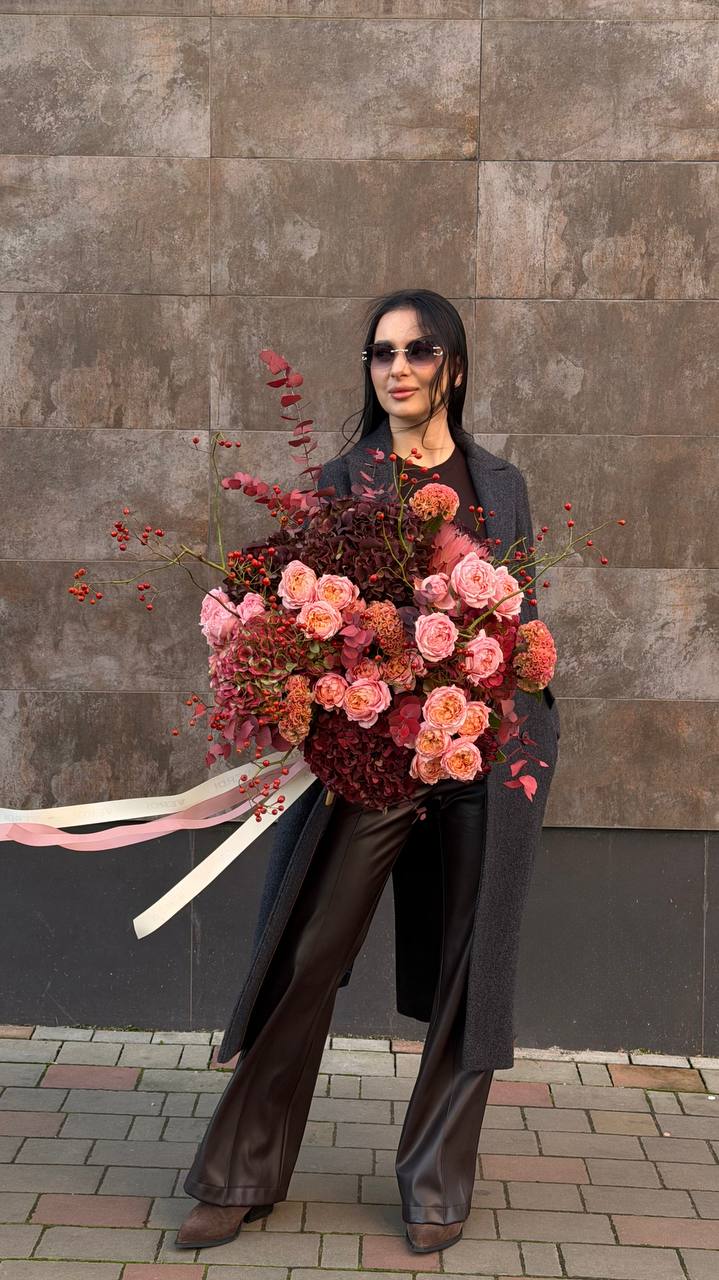Відкрийте для себе чарівну красу нашого елегантного букету з гортензій Magical Rubyred, гортензій Vienna, троянд Julietta, целозії Reprise Rose, протеї Barbigera, шипшини та екаліпту. Ця приголомшлива композиція складається з яскравих відтінків та вишуканих текстур, що робить її ідеальним подарунком для будь-якої події чи розкішним доповненням до вашого дому.