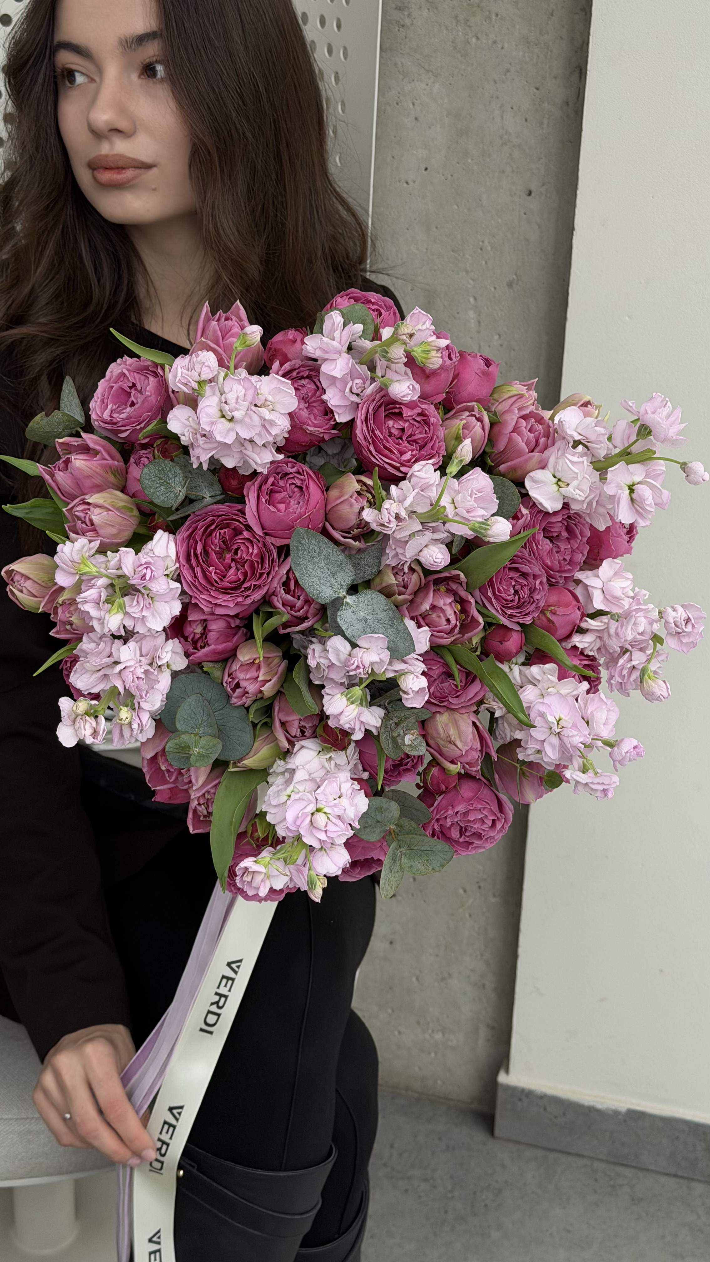 Відчуйте ідеальне поєднання елегантності з нашим приголомшливим букетом із тюльпанів, троянд Misty Bubbles, матіоли Iron Cherry та запашного евкаліпту. Ця яскрава композиція створена, щоб полонити серця та принести радість!