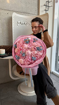 Ніжна та водночас об'ємна композиція, що поєднує в собі затишок і витонченість. До складу входять пишні рожеві півонії, суцвіття гортензії та дрібні блакитні квіти оксипеталуму, які створюють неповторний акцент. Букет оформлений у декілька шарів матового пакування ніжно-рожевого кольору, що підкреслює тендітність бутонів.