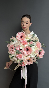 Ніжний та об'ємний букет, до складу якого входять фактурні рожеві гербери сорту "павук", пишні рожеві гвоздики, біла гортензія та кущові троянди пастельних відтінків. Особливого шарму композиції додають суцвіття рису (озотамнус) та ароматні гілочки евкаліпту. Букет зібраний у вільній формі та прикрашений довгими атласними стрічками, що підкреслюють його вишуканість.