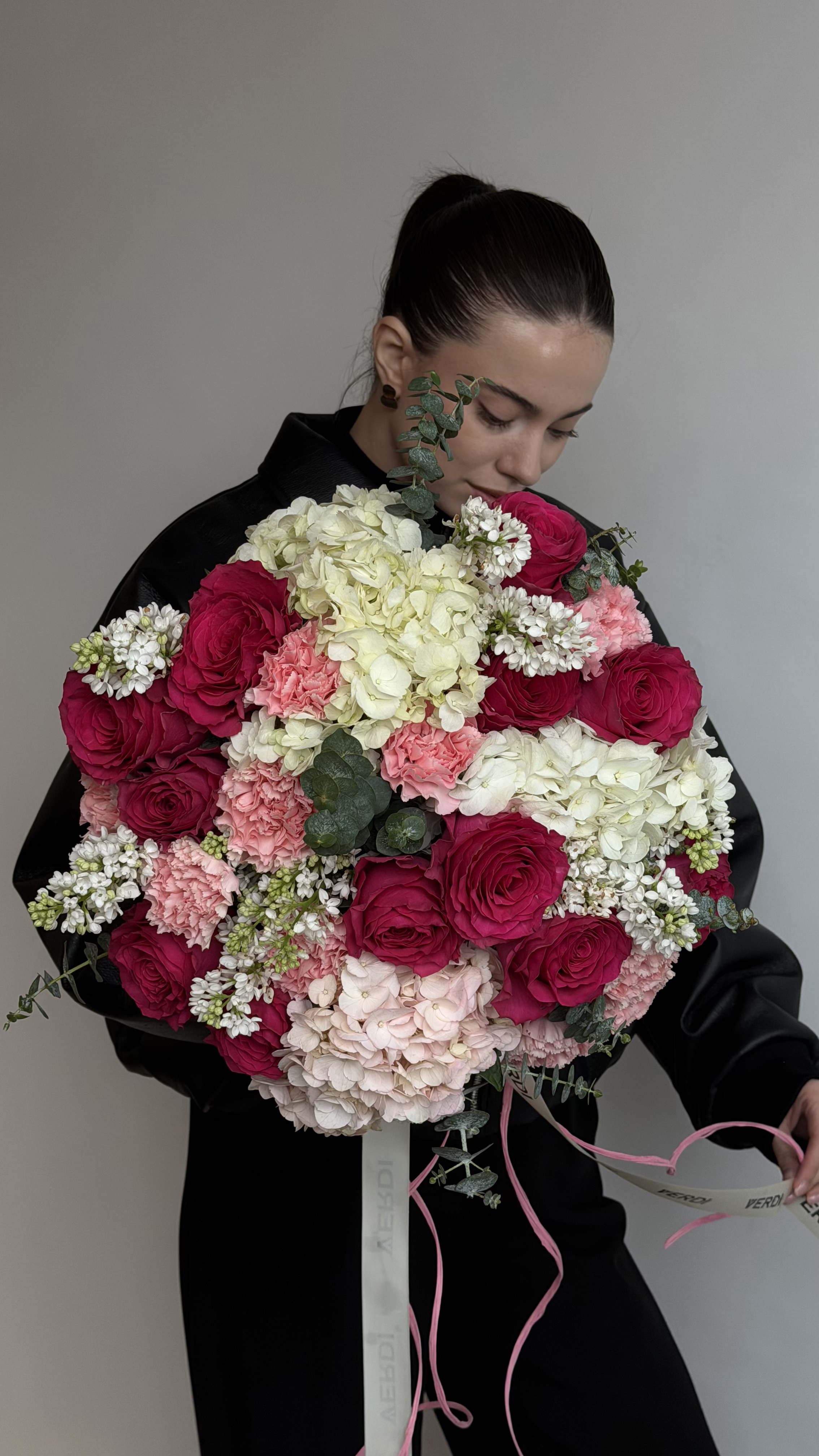 Масштабний та ароматний мікс-букет, що вражає різноманітністю фактур. У центрі композиції — розкішні шапки білої та кремової гортензії, доповнені яскравими малиновими трояндами, ніжно-рожевими гвоздиками та гілочками свіжого білого бузку. Евкаліпт додає букету природної легкості та приємного аромату.