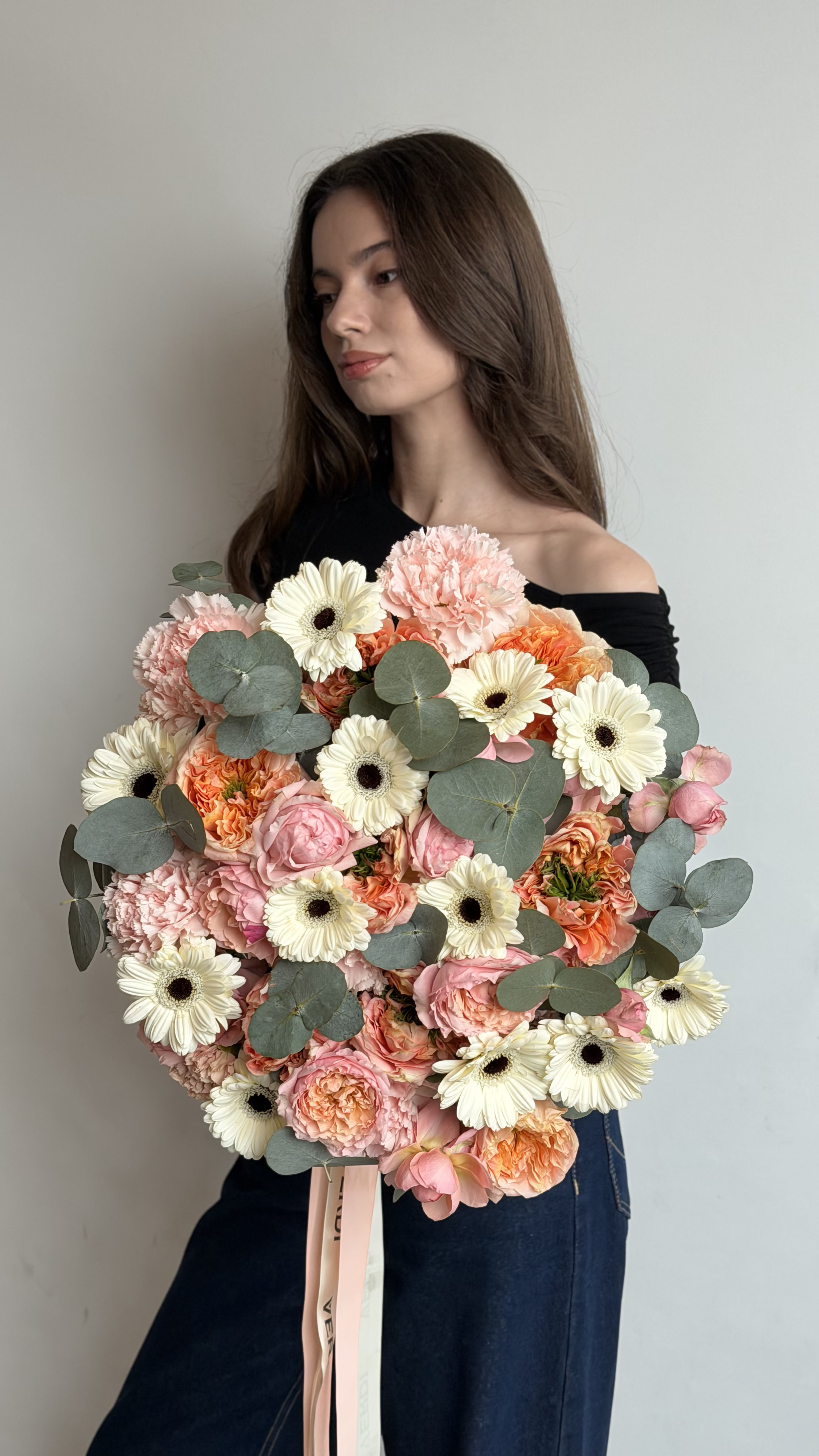 Цей сонячний та енергійний букет створений, щоб дарувати тепло та щирі усмішки. У центрі композиції — контрастні білі гербери з темною серцевиною, які ідеально поєднуються з пишними півонієподібними трояндами персикового та ніжно-рожевого відтінків. Особливої витонченості та сучасного вигляду букету надають великі матові листки евкаліпту, що додають об'єму та приємного тонкого аромату.