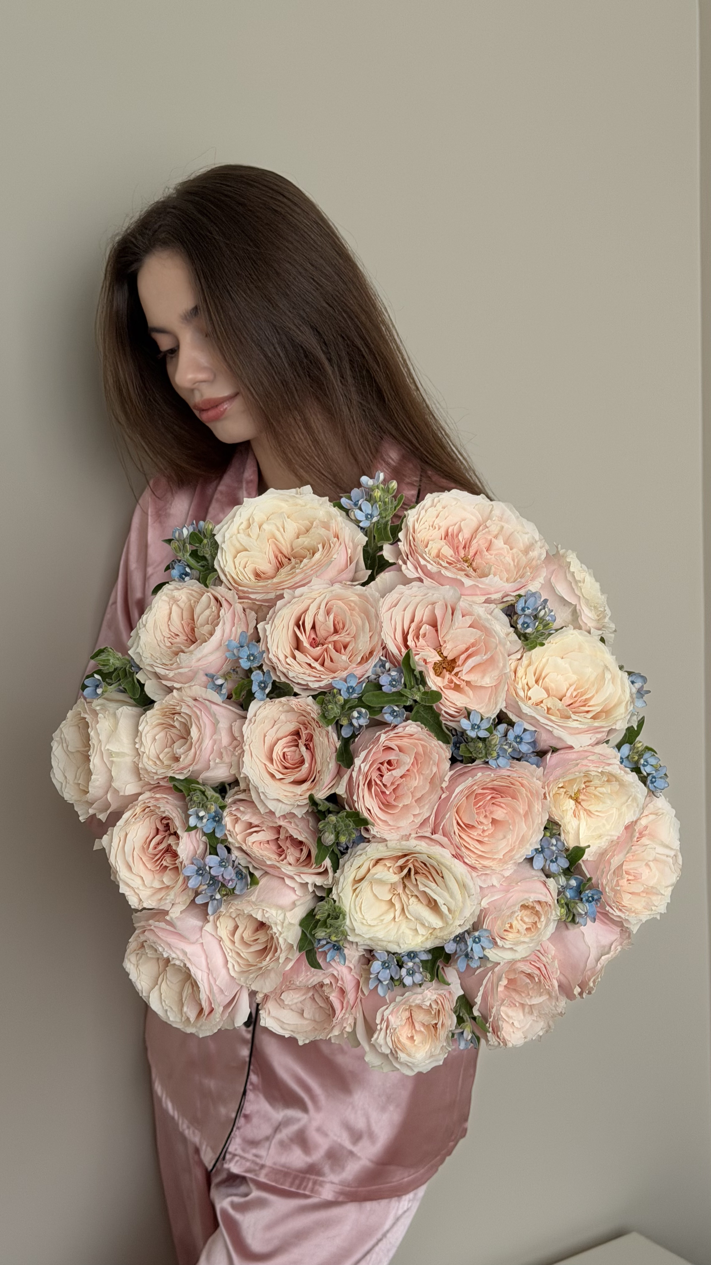Цей неймовірно пишний та витончений букет є справжнім втіленням ніжності та розкоші. Композиція складена з відбірних піоновидних троянд персикового та кремового відтінків, які вражають своєю багатошаровою фактурою та об'ємом. Особливого акценту та небесної легкості додають дрібні квіти блакитного оксипеталуму, що гармонійно контрастують із теплими тонами троянд.