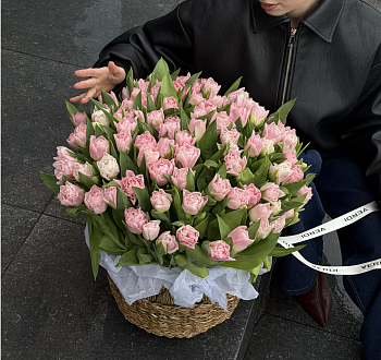 Ця розкішна плетена корзина, наповнена пишними рожевими тюльпанами, — справжнє втілення весняного натхнення. Для композиції обрано сортові піоновидні тюльпани з густими багатошаровими бутонами, які виглядають надзвичайно об'ємно та вишукано. Ніжний рожевий колір пелюсток у поєднанні з соковитою зеленню листя створює відчуття свіжості та природної гармонії.