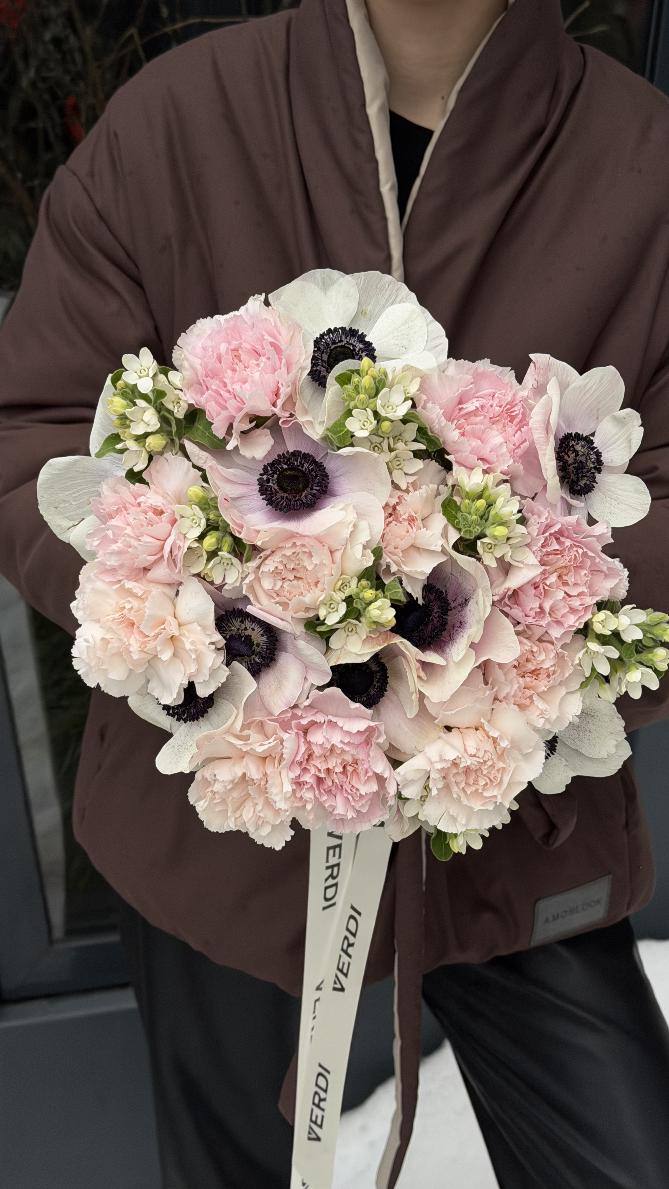 Цей витончений букет поєднує в собі ніжність рожевих гвоздик різних відтінків та елегантність білих анемонів з контрастними темними центрами. Композиція доповнена дрібними суцвіттями білого орнітогалуму, що додає їй особливої фактурності. Квіти перев’язані стильною фірмовою стрічкою, що підкреслює сучасний стиль подарунка. Такий букет ідеально підійде для коханої дівчини, мами або подруги на день народження, річницю чи як знак особливої уваги. Якщо ви шукаєте спосіб висловити щирі почуття, варто замовити букет, який виглядає водночас тендітно та вишукано. Ми гарантуємо лише свіжі квіти у кожній композиції, а наша професійна доставка квітів подбає про те, щоб ваш сюрприз був доставлений вчасно та у найкращому вигляді.