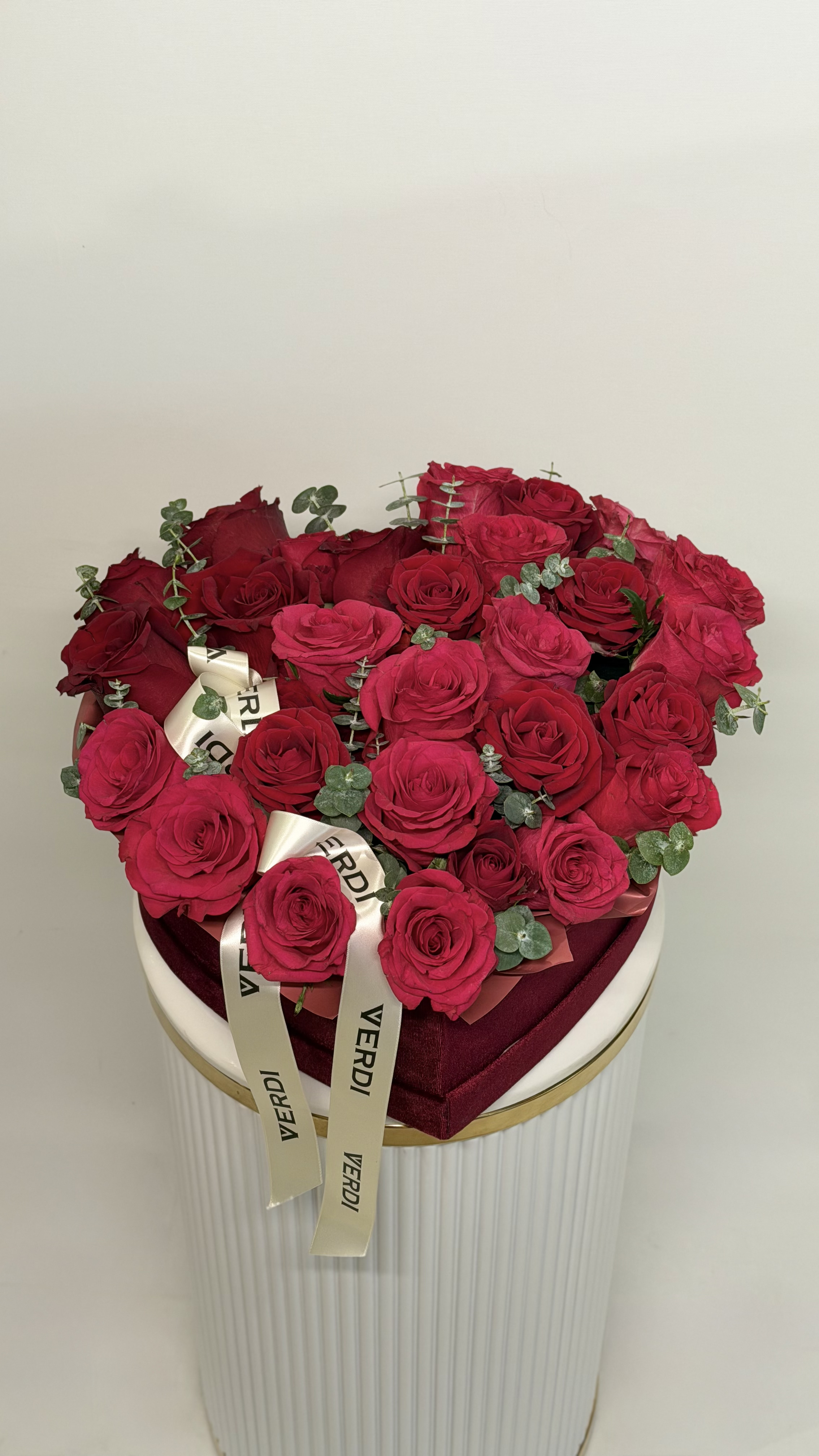 Ця романтична композиція у формі серця створена, щоб без слів розповісти про найщиріші почуття. Оксамитова коробка наповнена відбірними червоними трояндами, які гармонійно доповнені делікатними гілочками евкаліпту та вишуканою світлою стрічкою. Такий подарунок ідеально підійде для коханої дівчини або дружини на річницю, День святого Валентина або як особливий знак уваги. Якщо ви плануєте замовити букет, що символізує любов, ці свіжі квіти стануть бездоганним вибором. Наша доставка квітів допоможе зробити ваш сюрприз незабутнім, даруючи радість вашим близьким.