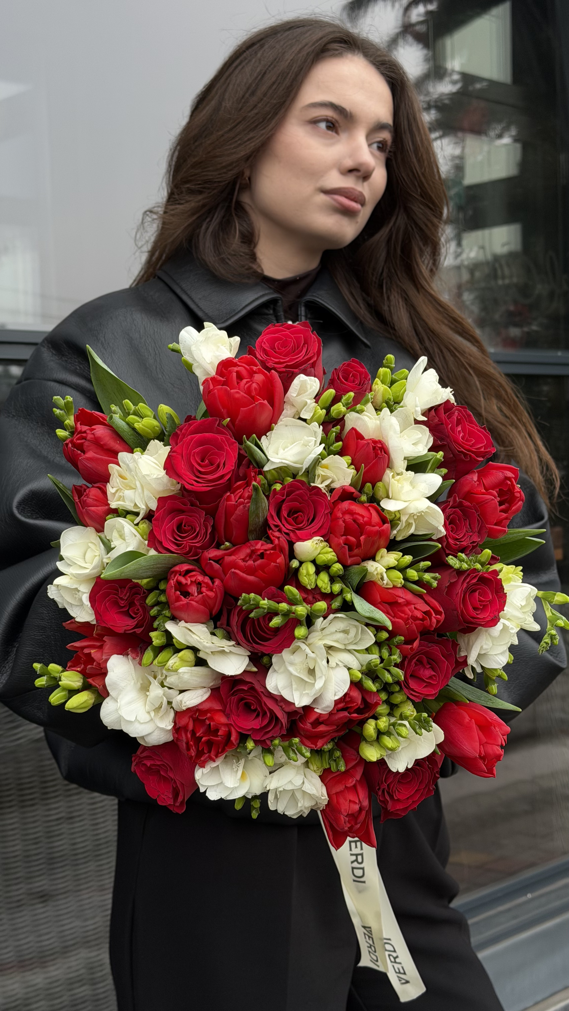 Цей контрастний та енергійний букет вражає поєднанням насичених червоних тюльпанів, класичних троянд та тендітної білої фрезії. Білосніжні суцвіття фрезії додають композиції легкості та витонченого аромату, а соковита зелень підкреслює яскравість бутонів. Такий стильний та пишний букет стане ідеальним подарунком для дівчини на побачення, дружини на річницю або для колеги, щоб підняти настрій. Якщо ви шукаєте спосіб висловити захоплення, ми рекомендуємо купити квіти у такому гармонійному поєднанні. Наші свіжі квіти завжди виглядають бездоганно, а швидка доставка квітів допоможе вчасно привітати дорогу вам людину. Замовити букет можна прямо зараз, щоб подарувати незабутні емоції.