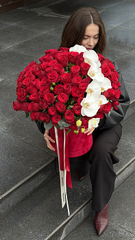 Розкішна та масштабна композиція у велюровій капелюшній коробці насиченого червоного кольору. Основу цього величного ансамблю складають десятки добірних червоних троянд, які створюють щільне оксамитове полотно. Вишуканим акцентом слугує гілка білої орхідеї фаленопсис, що спадає каскадом, додаючи композиції особливого статусу та елегантності. Квіти надійно зафіксовані у флористичній губці, що дозволяє їм зберігати свіжість без вази.