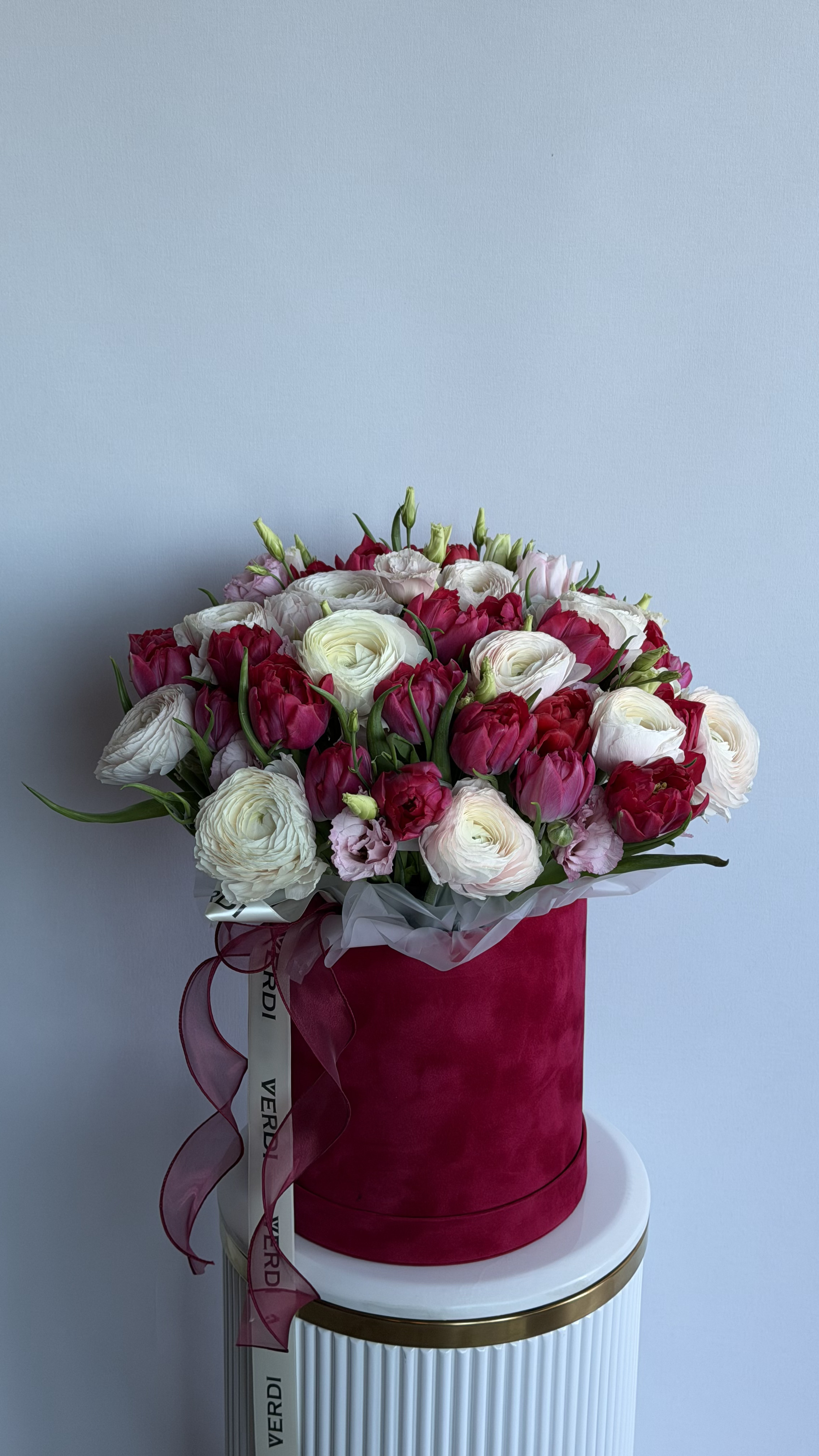 Ця яскрава та водночас ніжна композиція представлена в оксамитовій коробці насиченого малинового кольору. Основу букета складають пишні білі ранункулюси, витончені малинові тюльпани та тендітні гілочки еустоми рожевих відтінків. Таке поєднання кольорів і текстур створює стильний та сучасний образ. Свіжі квіти у флористичній губці довше зберігають свою красу, що робить цей варіант дуже практичним. Це ідеальний вибір, щоб привітати подругу з днем народження, висловити вдячність колезі або зробити романтичний сюрприз для дівчини. Якщо ви плануєте замовити букет, який виглядає дорого та естетично, ця коробка — саме те, що потрібно. Наша доставка квітів подбає про те, щоб подарунок прибув у ідеальному стані.