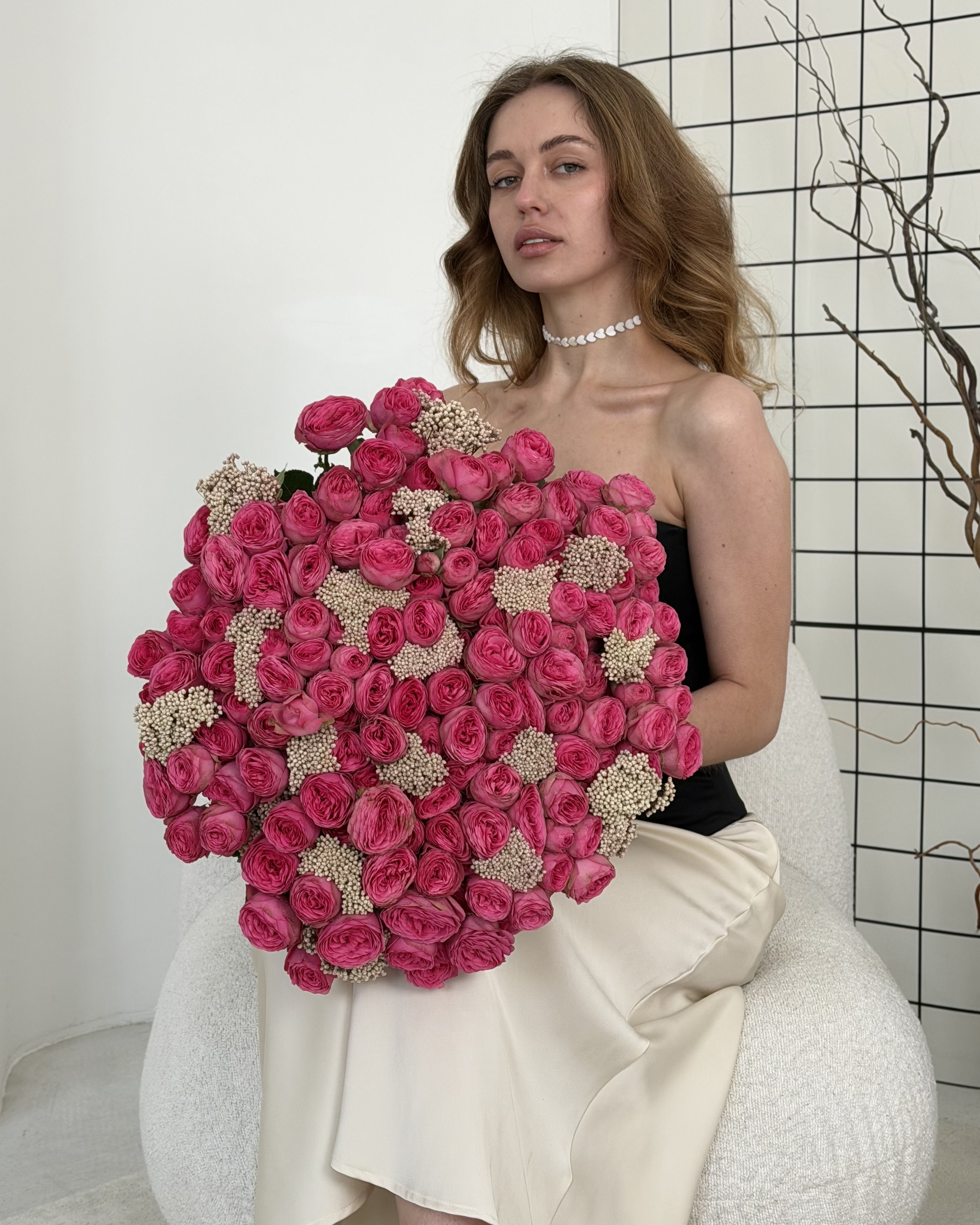Цей неймовірний та об'ємний букет створений із десятків добірних кущових троянд насиченого яскраво-рожевого кольору. Вишукану текстуру композиції підкреслюють суцвіття кремового озотамнусу, які додають букету особливого шарму та витонченості. Така пишна композиція без слів розповість про ваші почуття і стане ідеальним подарунком на день народження, річницю або значущу подію для близької людини. Якщо ви плануєте купити квіти, які здатні по-справжньому здивувати своєю красою, цей варіант — саме те, що вам потрібно. Наші свіжі квіти довго радуватимуть одержувача, а швидка доставка квітів зробить момент вручення бездоганним.