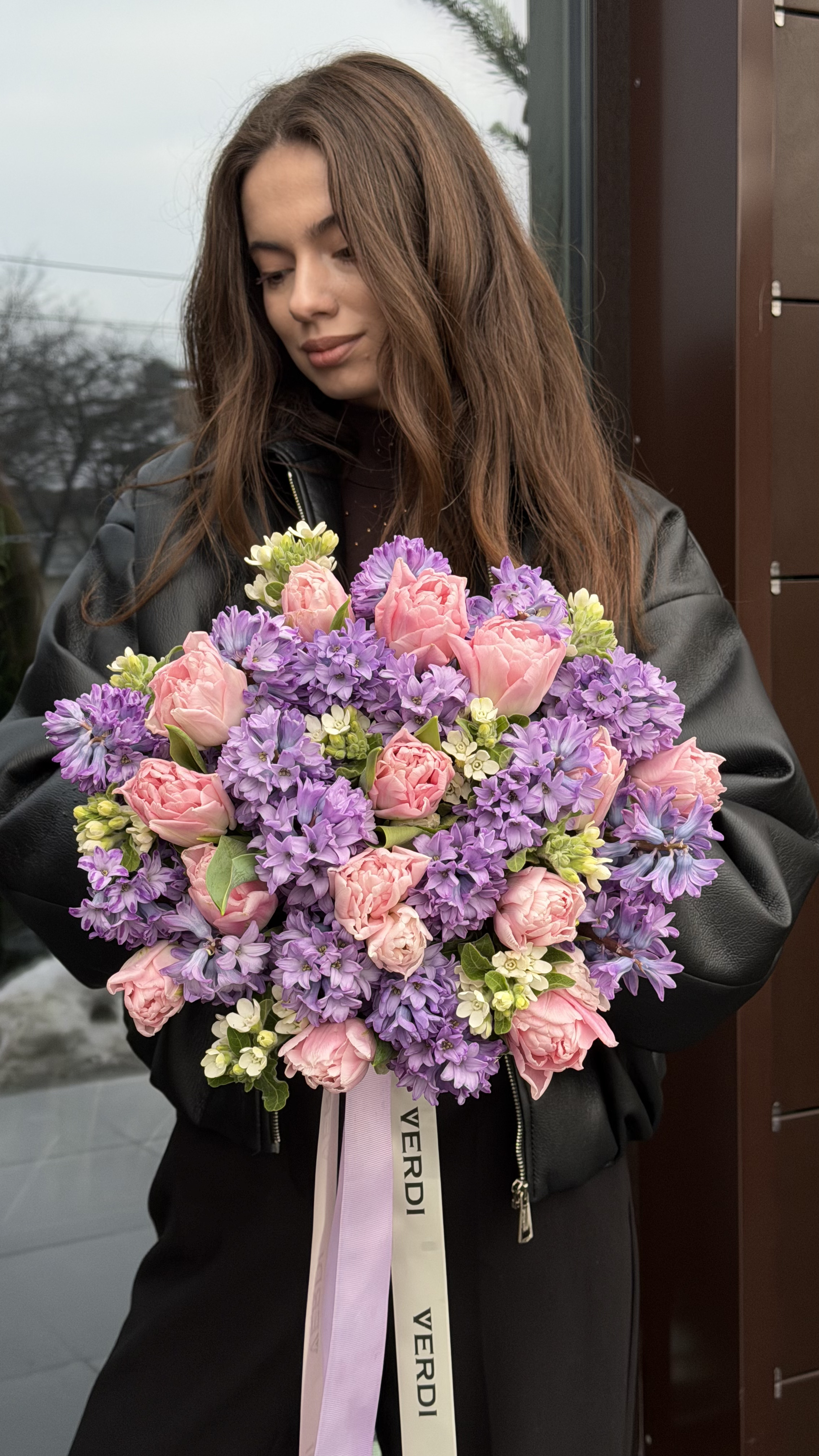 Цей неймовірно ніжний та текстурний букет поєднує в собі об'ємні рожеві півонієподібні тюльпани та пишні суцвіття бузкових гіацинтів. Доповнюють композицію дрібні квіти білого оксипеталуму, що додають особливої витонченості. Букет випромінює неповторний весняний аромат і вражає своєю свіжістю та гармонією кольорів. Така квіткова композиція стане ідеальним подарунком для дівчини, мами або колеги на день народження чи як теплий жест уваги. Якщо ви бажаєте замовити букет, який символізує пробудження природи та щирість почуттів, ці свіжі квіти створені саме для вас. Наша швидка доставка квітів допоможе вам подарувати свято в будь-який момент.