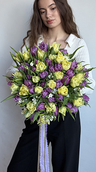 Цей яскравий та енергійний букет складається з великої кількості сортових піоноподібних тюльпанів насиченого жовтого та глибокого фіолетового кольорів. Особливої витонченості композиції додають дрібні білі квіти оксипеталуму, які розсипані між бутонами, наче перлинки. Таке контрастне поєднання кольорів робить букет ідеальним подарунком, щоб підняти настрій, привітати з днем народження або початком весни. Він чудово підійде для активної дівчини, подруги чи колеги. Якщо ви хочете замовити букет, який вражає своєю об'ємністю та життєрадісністю, цей варіант — саме те, що треба. Наші свіжі квіти довго зберігатимуть свою красу, а швидка доставка квітів допоможе вам зробити приємний сюрприз вчасно.