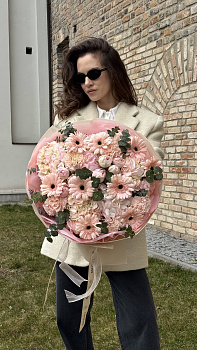 Цей неймовірно ніжний та пишний букет створений для справжніх поціновувачів вишуканості. У складі композиції гармонійно поєдналися витончені рожеві гербери, об'ємні суцвіття гортензії та романтичні піоноподібні троянди, доповнені гілочками ароматного евкаліпту. Багатошарове пакування у рожевих та пастельних відтінках додає букету особливого шарму та об'єму. Такий подарунок стане ідеальним вибором для дівчини на побачення, мами до дня народження або як зворушливе привітання колеги. Якщо ви бажаєте купити квіти, які гарантовано подарують щиру усмішку, цей варіант — безпрограшний. Наші завжди свіжі квіти стануть окрасою свята, а швидка доставка квітів дозволить вам зробити сюрприз навіть на відстані. Достатньо лише замовити букет, і ми подбаємо про ідеальне виконання.