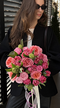 Цей ефектний та насичений букет привертає увагу своїм соковитим поєднанням відтінків фуксії та корала. Основу композиції складають розкішні піоноподібні троянди декількох сортів та оригінальні кущові гвоздики з гофрованими пелюстками. Унікальності букету надають оригінальні зелені суцвіття та щільне листя рускуса, що створюють свіжий контраст. Повітряне оформлення прозорою та білою стрічками додає композиції легкості. Такий букет стане чудовим подарунком для коханої дівчини на побачення, стильним сюрпризом для подруги на день народження або яскравим привітанням для сестри. Якщо ви хочете замовити букет, який вражає своєю красою та сучасним дизайном, ці свіжі квіти — ідеальний вибір. Наша швидка доставка квітів допоможе вам зробити незабутній подарунок близькій людині вчасно.