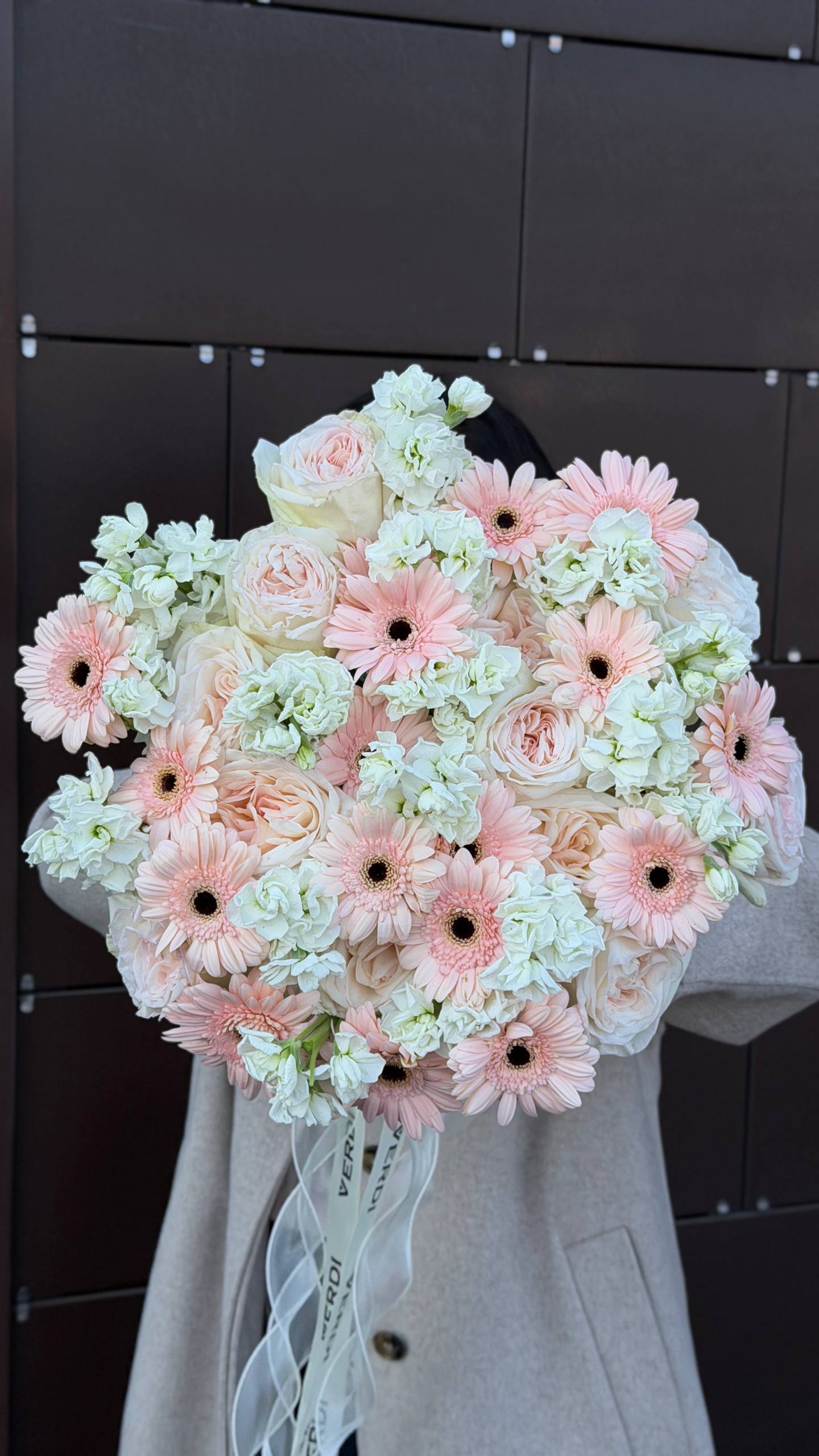 Цей повітряний та надзвичайно ніжний букет у пастельних тонах випромінює чистоту та витонченість. Основу композиції складають розкішні кремові піоноподібні троянди, які гармонійно поєднуються з тендітними світло-рожевими герберами. Особливої пишності та тонкого аромату додають суцвіття білої матіоли, що створюють неповторну фактуру. Така світла композиція стане ідеальним подарунком для коханої дівчини, вишуканим сюрпризом на весілля або ніжним привітанням для мами. Якщо ви хочете замовити букет, який підкреслить ваші щирі почуття, ці свіжі квіти — найкращий вибір. Наша швидка доставка квітів подбає про те, щоб ця краса була вручена вчасно та у найкращому вигляді.