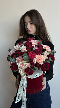 Вишукана композиція у оксамитовій коробці глибокого винного кольору, що поєднує в собі пристрасні червоні та ніжні персикові троянди преміальних сортів. Особливу фактурність букету надають пишні кущові троянди та ароматні гілочки евкаліпту. Оформлення у коробці доповнене елегантною брендованою стрічкою та декоративним намистом, що перетворює композицію на справжній витвір мистецтва.