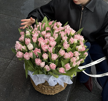 Ця грандіозна композиція складається зі 101 свіжого тюльпана елітного півонієподібного сорту. Ніжно-рожеві бутони з численними пелюстками створюють неймовірний об'єм та виглядають надзвичайно вишукано у великій плетеній корзині. Оформлення доповнене білим папером тиш'ю та брендованими стрічками, що підкреслює преміальний статус подарунка.