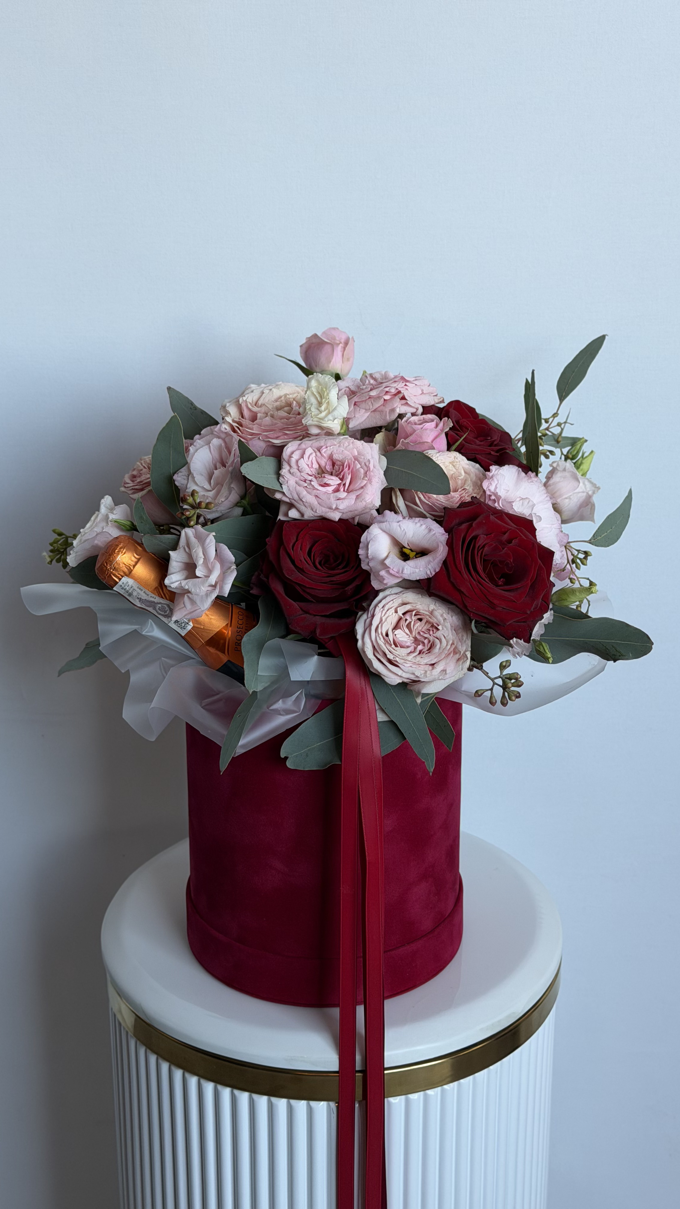 Ця розкішна композиція у бордовій велюровій коробці поєднує в собі елегантність свіжих квітів та святковий настрій. До складу входять вишукані піоноподібні рожеві троянди, класичні червоні троянди, ніжна еустома та гілочки евкаліпту, що додають ансамблю особливого шарму. Родзинкою набору є пляшка ігристого вина, гармонійно інтегрована в букет. Такий подарунок ідеально підійде для коханої дівчини, дружини або близької подруги на День народження, річницю чи романтичний вечір. Якщо ви бажаєте замовити букет, який вражає з першого погляду, ця преміальна коробка стане найкращим вибором. Наша професійна доставка квітів подбає про те, щоб ваш сюрприз був доставлений вчасно та у найкращому вигляді.