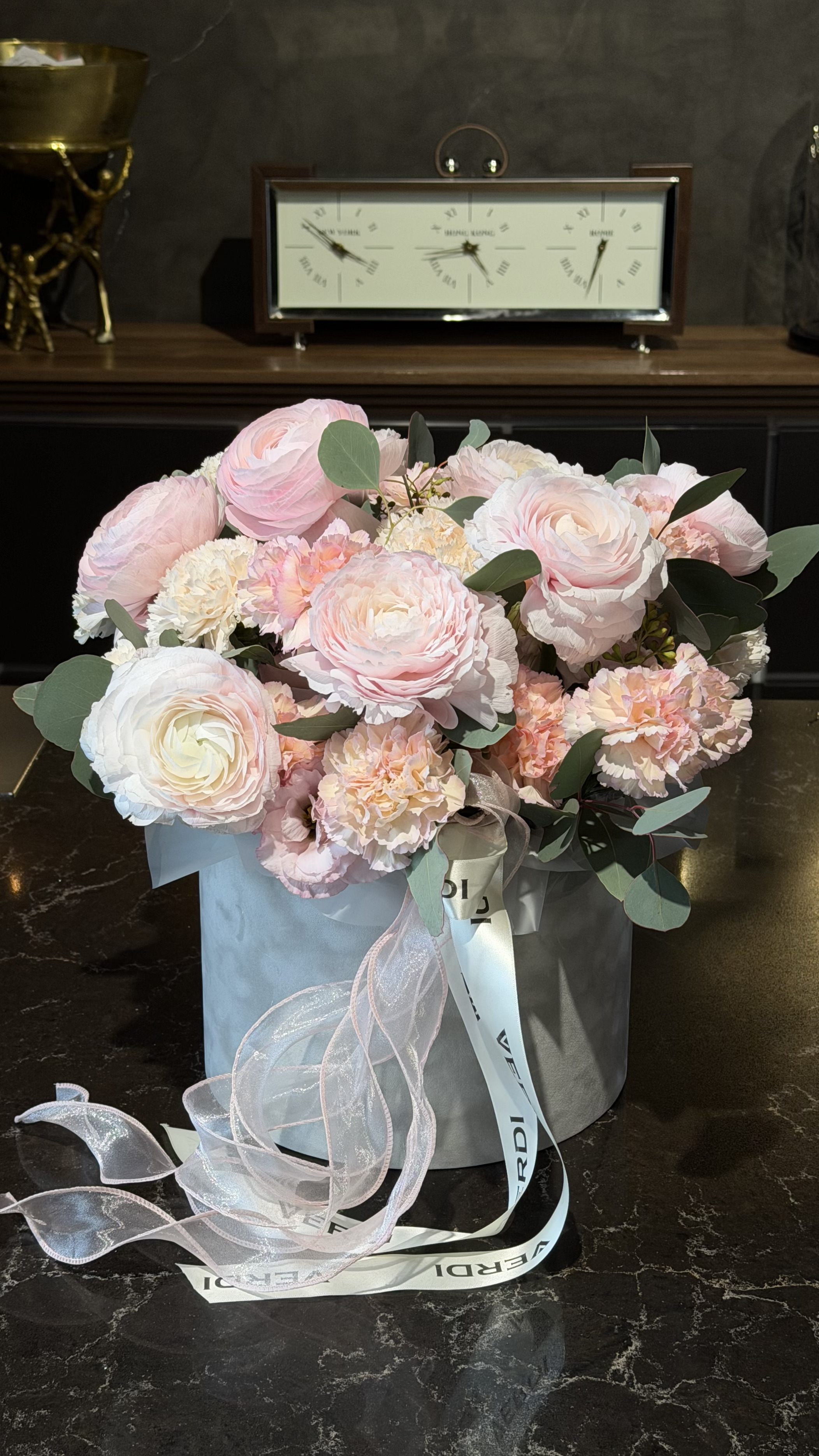 Ця ніжна та повітряна композиція у велюровій коробці сірого кольору створена для справжніх поціновувачів естетики. Головну роль відіграють об'ємні рожеві ранункулюси з безліччю тонких пелюсток, які гармонійно поєднуються з пухнастими персиковими гвоздиками та гілочками свіжого евкаліпту. Особливої витонченості додають напівпрозорі фатинові стрічки та брендований декор. Така коробка стане ідеальним подарунком для мами, сестри або коханої дівчини на день народження, річницю або просто як вишуканий комплімент. Свіжі квіти у коробці не потребують вази, що робить цей презент максимально зручним. Якщо ви хочете замовити букет, який випромінює тепло та ніжність, цей варіант буде найкращим. Наша швидка доставка квітів допоможе вам красиво привітати близьких.