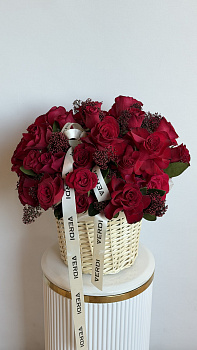 Ця класична та водночас розкішна композиція у світлій плетеній корзині є справжнім символом елегантності. Вона повністю сформована з добірних червоних троянд насиченого відтінку, які гармонійно поєднуються з дрібними суцвіттями бордової скімії. Таке поєднання додає букету особливої фактурності та вишуканого вигляду. Білі брендовані стрічки створюють стильний контраст, підкреслюючи преміальність подарунка. Ця корзина стане ідеальним вибором для особливого випадку: ювілею, річниці або як незабутній вияв кохання. Якщо ви хочете замовити букет, що вражає своєю величчю та благородством, ці свіжі квіти — саме те, що ви шукали. Наша доставка квітів працює для того, щоб ви могли привітати близьких красиво та вчасно.
