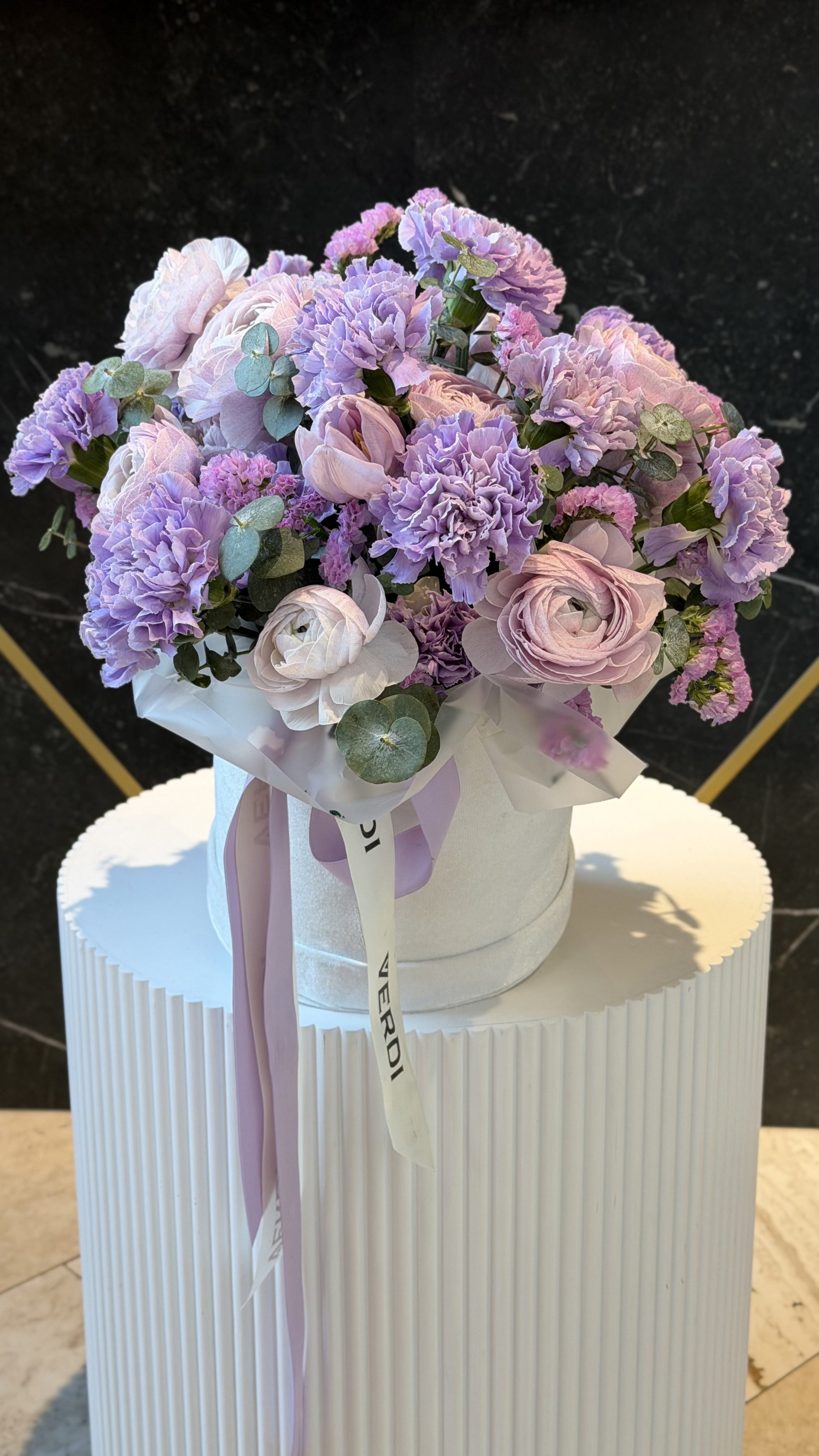 Ця повітряна та неймовірно ніжна композиція у світлій велюровій коробці створена, щоб дарувати натхнення. Основу букета складають пишні бузкові гвоздики з гофрованими пелюстками та тендітні ніжно-рожеві ранункулюси. Особливої текстурності додають дрібні суцвіття фіолетової статиці та округлі листочки евкаліпту, які наповнюють простір легким ароматом. Композиція прикрашена витонченими стрічками, що підкреслюють її преміальний статус. Такий подарунок ідеально підійде для дівчини, сестри або колеги на День народження, професійне свято чи просто як вишуканий комплімент. Якщо ви хочете замовити букет, який вражає своєю естетикою та стійкістю, ці свіжі квіти у коробці будуть найкращим вибором. Наша швидка доставка квітів допоможе вам зробити приємний сюрприз близькій людині вчасно та красиво.