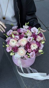 Ця розкішна композиція у капелюшній коробці вражає багатством фактур та ніжністю палітри. До складу входять пишні світло-рожеві ранункулюси, витончена еустома та густомахрові тюльпани насиченого малинового відтінку. Елегантна коробка з рожевим оксамитовим покриттям та брендована стрічка підкреслюють преміальний статус подарунка. Такий ансамбль стане ідеальним вибором для коханої дівчини, дружини або мами на день народження, річницю чи особливе свято. Якщо ви шукаєте спосіб висловити найщиріші почуття, варто купити квіти саме в такому виконанні — вони гарантовано створять атмосферу свята. Наші свіжі квіти довго зберігатимуть свій вигляд завдяки спеціальній флористичній губці всередині коробки, а швидка доставка квітів допоможе зробити сюрприз максимально неочікуваним та приємним.
