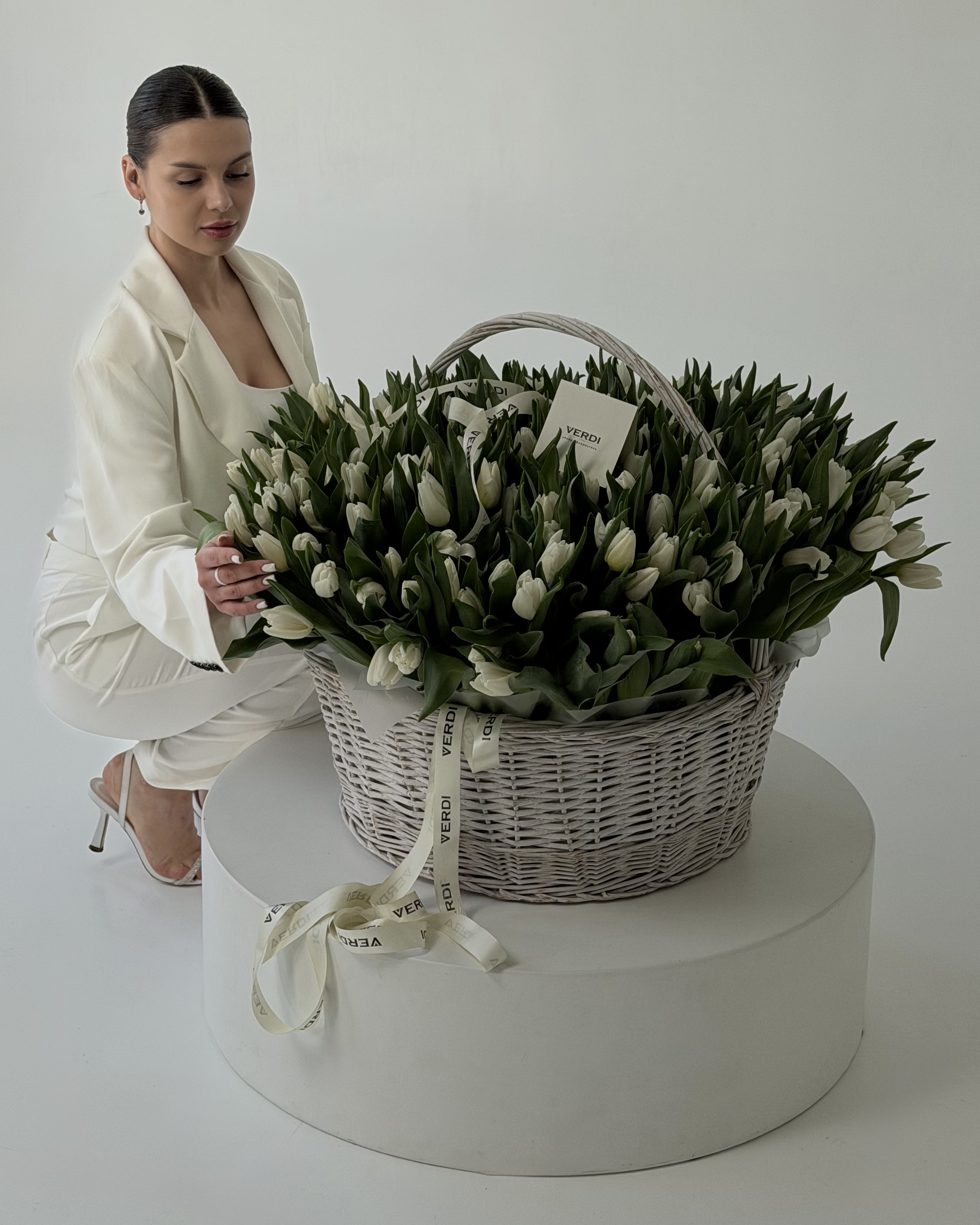 Ця грандіозна композиція складається з сотень білосніжних тюльпанів, щільно викладених у велику плетену корзину світлого відтінку. Свіжі бутони з соковитим зеленим листям створюють ефект справжнього весняного саду, а фірмові стрічки підкреслюють преміальну якість подарунка. Такий розкішний презент ідеально підійде для особливої події: весілля, ювілею, річниці або як щирий жест вдячності для близької людини. Якщо ви бажаєте вразити масштабом та витонченістю, варто замовити букет у такому виконанні. Наша професійна доставка квітів подбає про те, щоб ці свіжі квіти прибули до отримувача в ідеальному стані та подарували незабутні емоції.
