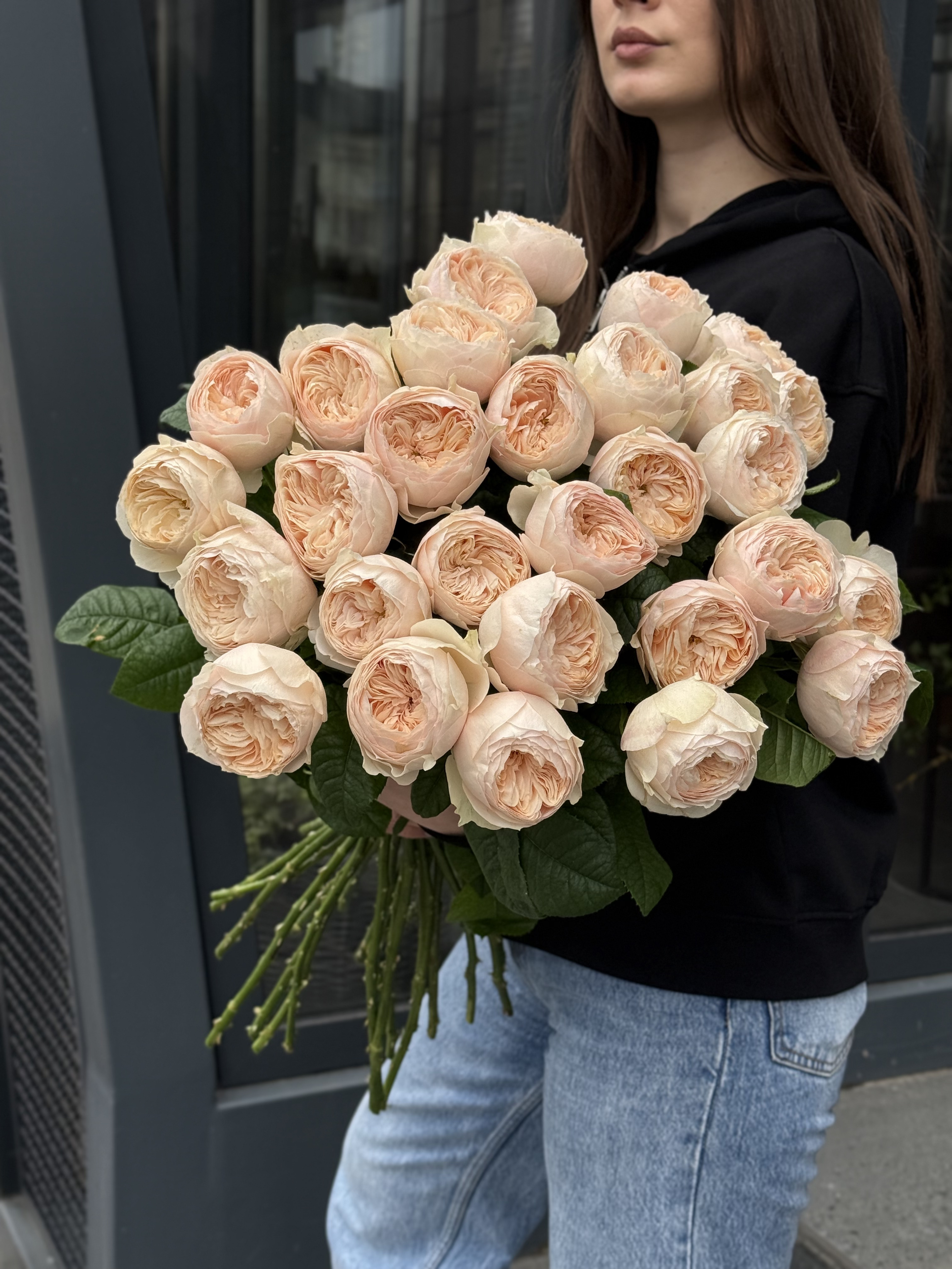 Розкішний монобукет з пишної піоновидної троянди Emma Woodhouse. Доставка у спеціальній коробці для транспортування – захищає букет від пошкоджень під час перевезення. Додаємо підживку – ваш букет довше зберігатиме свіжість. Доставка по Луцьку та області.