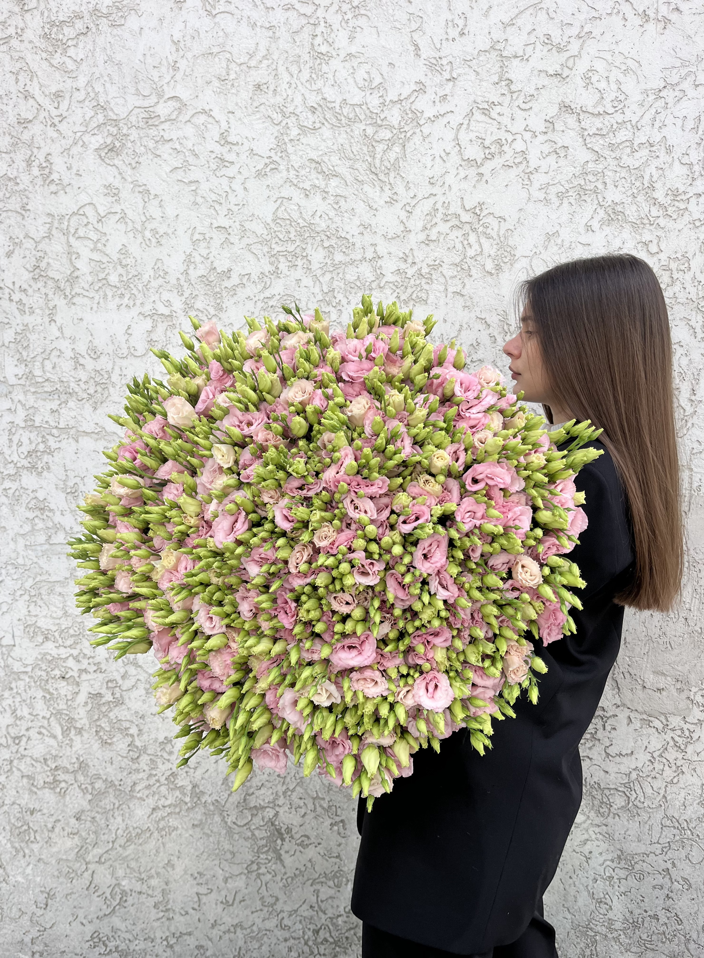 Романтичний монобукет з еустом Lisanne Pink. Спеціальна коробка запобігає пошкодженням, підживка подовжує життя квітів. Доставка по Луцьку та області.