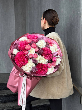 Цей ефектний та контрастний букет створений для тих, хто цінує яскраві емоції та вишуканий стиль. Основу композиції складають розкішні малинові піоновидні троянди сорту Country Blues та ніжні пудрові троянди Royal Blush, які ідеально відтіняються білосніжними гвоздиками. Особливу текстуру та об'єм букету додають суцвіття бордової скімії, створюючи витончений мереживний ефект. Весь ансамбль оформлений у професійне багатошарове пакування насиченого рожевого кольору з фірмовими стрічками. Така об'ємна композиція стане ідеальним подарунком на день народження, річницю або як грандіозний сюрприз для особливої людини. Якщо ви хочете замовити букет, який вражає з першого погляду, цей варіант бездоганний. Ми гарантуємо лише свіжі квіти, а наша надійна доставка квітів дбайливо привезе цю красу за вказаною адресою. Поспішайте купити квіти, які допоможуть зробити ваше свято незабутнім.