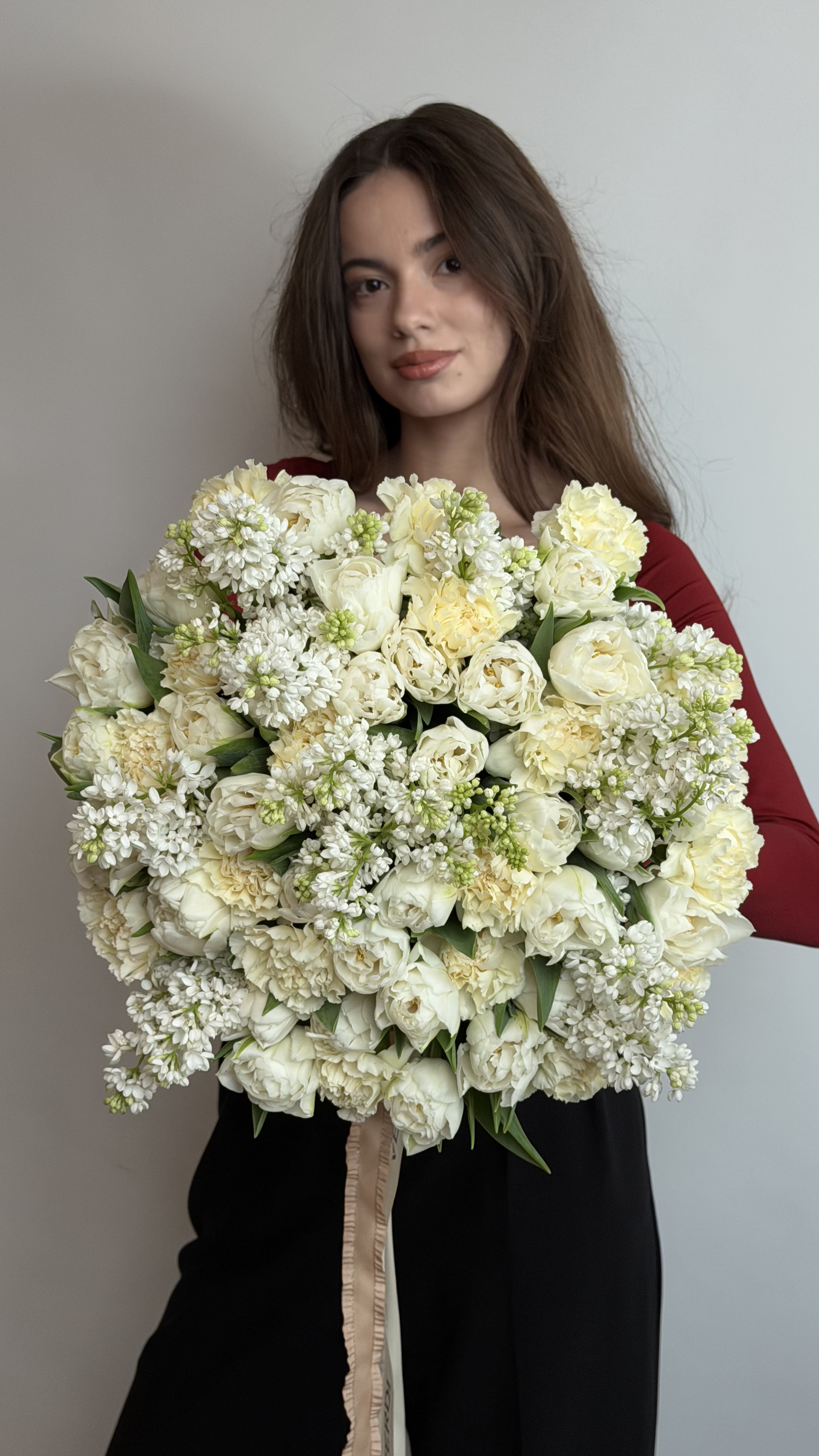 Неймовірно пишний та ніжний букет, що випромінює весняну свіжість та елегантність. До складу цієї об'ємної композиції входять багатошарові білі тюльпани, розкішні півонії та ароматні гілочки білого бузку. Світло-кремові гвоздики додають букету особливої м'якості та фактурності, створюючи вишукану гру відтінків білого та айворі. Композиція прикрашена витонченою стрічкою, що підкреслює її преміальний статус.