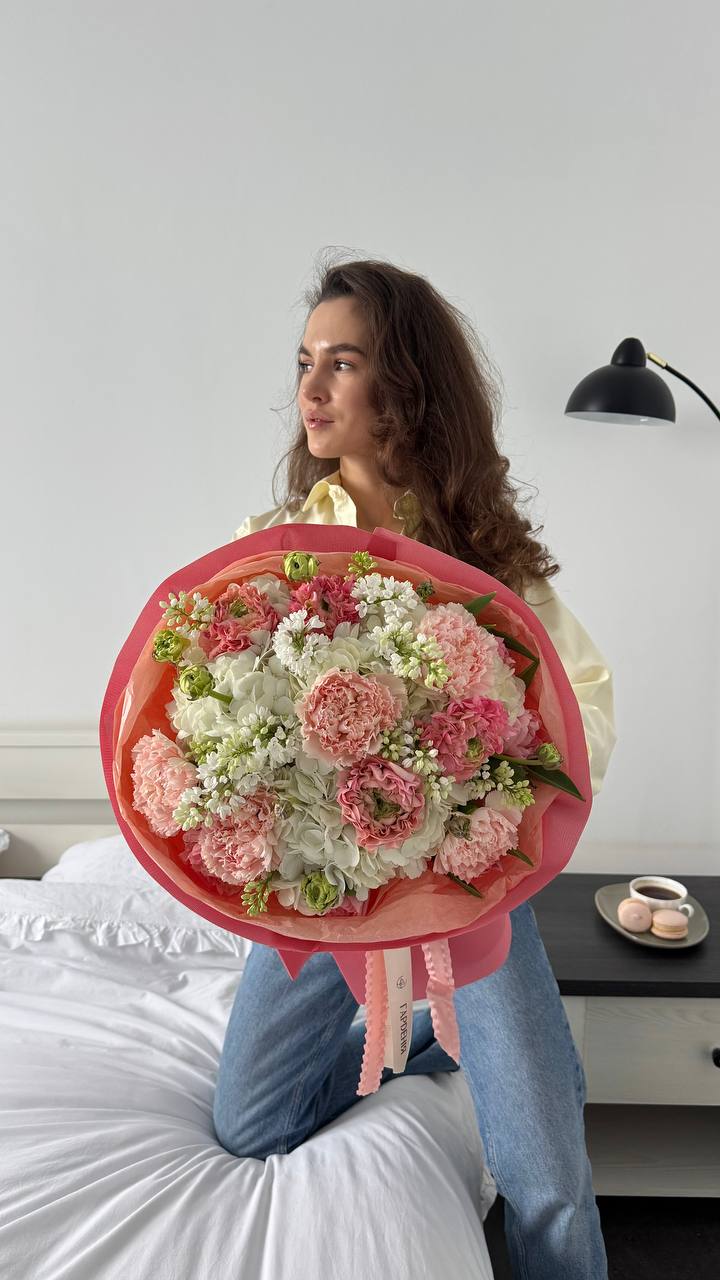 Ніжна та багатофактурна композиція, що поєднує в собі найвишуканіші весняні квіти. Основу букета складають розкішні піоновидні тюльпани та кучеряві ранункулюси з густими пелюстками, які гармонійно перегукуються з пишними персиковими гвоздиками (діантусами). Особливого аромату та легкості додають гілочки білого бузку, а сизий евкаліпт завершує образ, надаючи йому природного стилю. Квіти зібрані під стрічку, що підкреслює їхню природну красу та витонченість кожного бутона.