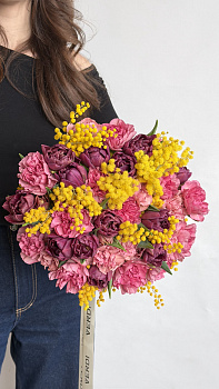 Цей яскравий та по-справжньому весняний букет випромінює сонячний настрій та тепло. У центрі композиції — глибокі фіолетові тюльпани та пишні рожеві гвоздики, які створюють багату фактуру та насичену кольорову гаму. Головним акцентом виступають пухнасті гілочки жовтої мімози, що додають букету особливої легкості, об'єму та неповторного аромату.
