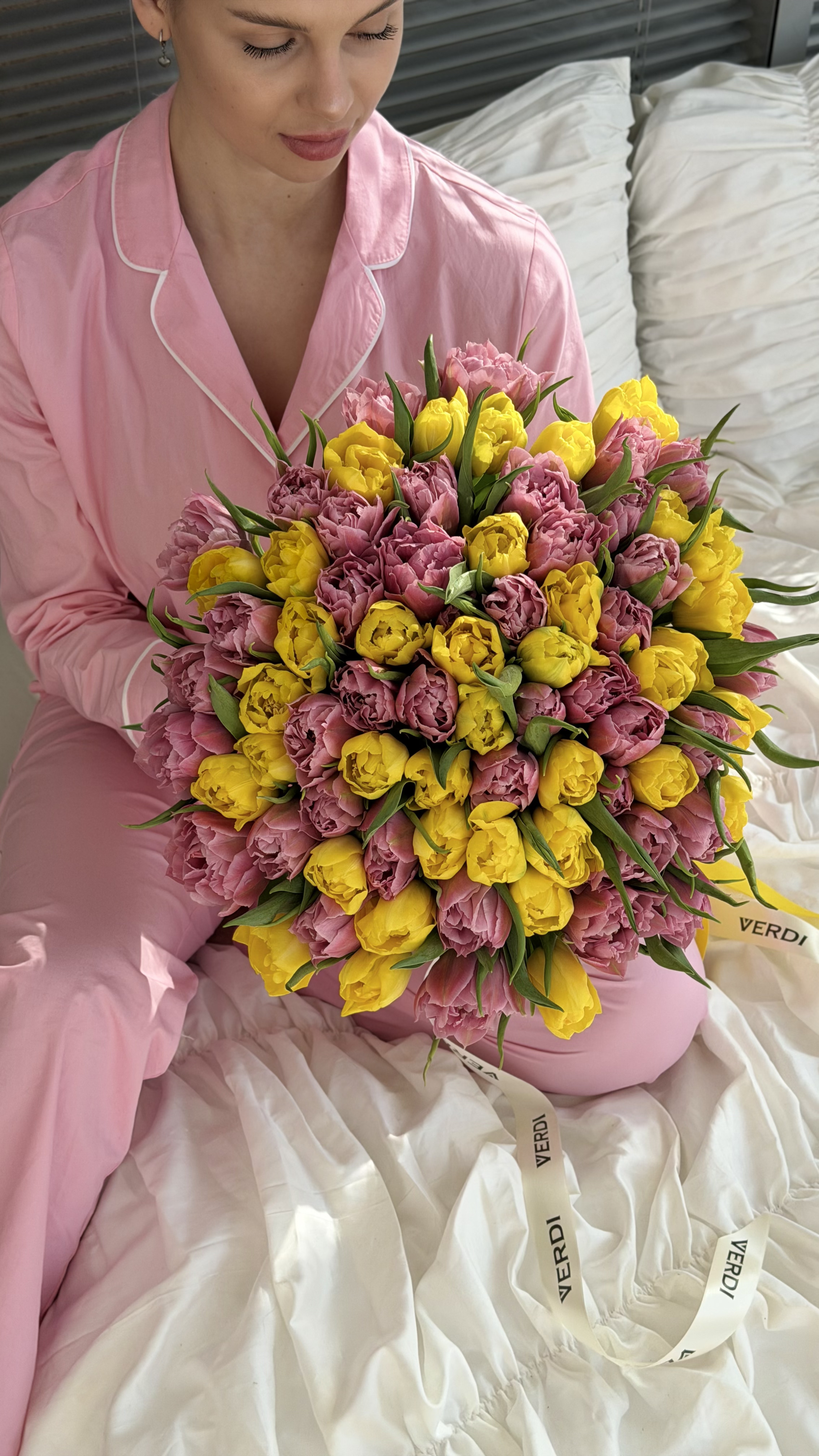 Цей ефектний букет складається з великої кількості пишних півонієподібних тюльпанів у яскравому поєднанні сонячно-жовтого та ніжно-рожевого відтінків. Завдяки своїй багатошаровій структурі та великій кількості бутонів, квіти виглядають надзвичайно об'ємно, створюючи святковий весняний настрій. Лаконічне оформлення букета без зайвого пакування підкреслює природну красу та витонченість кожного бутона, а біла стрічка з фірмовим логотипом додає композиції завершеності та елегантності. Такий життєрадісний букет стане ідеальним подарунком для коханої дівчини, дружини або мами на день народження, річницю або як особливий знак уваги. Якщо ви бажаєте замовити букет, що поєднує в собі весняну свіжість та яскраві емоції, цей варіант буде найкращим вибором. Наша швидка доставка квітів допоможе вам привітати близьких та подарувати їм незабутні емоції.
