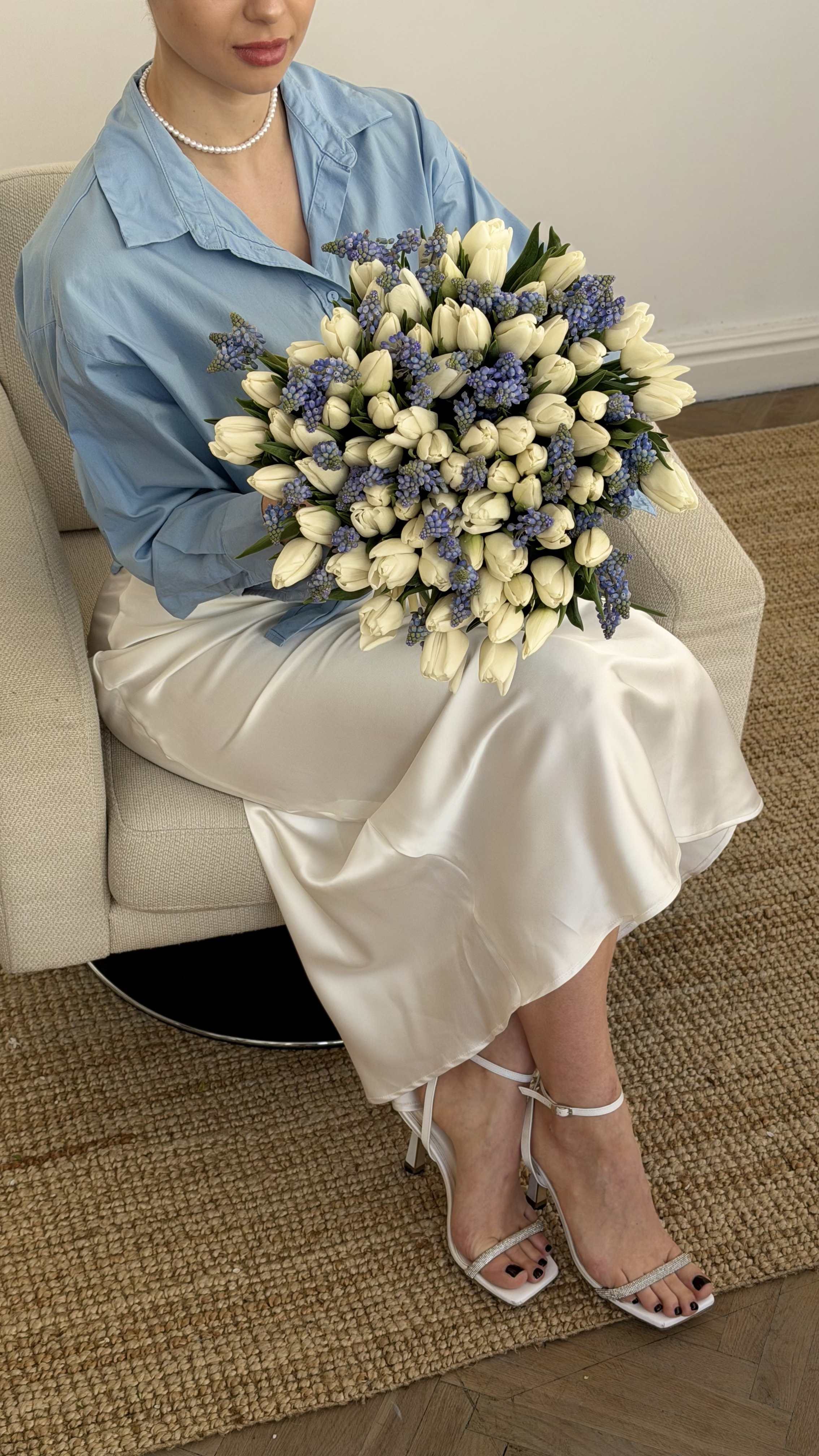 Цей витончений та стильний букет поєднує в собі лаконічну красу білих тюльпанів класичної форми та ніжні акценти синього мускарі. Білосніжні бутони тюльпанів створюють основу композиції, а дрібні суцвіття мускарі додають їй особливого весняного шарму, фактурності та приємного кольорового контрасту. Такий елегантний мікс стане ідеальним подарунком для коханої дівчини, дружини, мами або колеги на день народження, річницю або просто як вишуканий знак уваги. Якщо ви бажаєте замовити букет, який виглядає сучасно, свіжо та водночас ніжно, цей варіант — чудовий вибір. Наші свіжі квіти довго зберігатимуть свій бездоганний вигляд, а професійна доставка квітів допоможе вам зробити приємний сюрприз близькій людині вчасно.