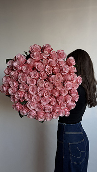 Розкішний букет складається з добірних еквадорських троянд ніжного рожевого відтінку - 71 шт. Еквадорська троянда вирізняється своїм великим, щільним бутоном та міцним стеблом, що дозволяє композиції виглядати максимально об'ємно та презентабельно. Квіти зібрані у велику класичну оберемку, яка підкреслює статусність та вишуканість подарунка.