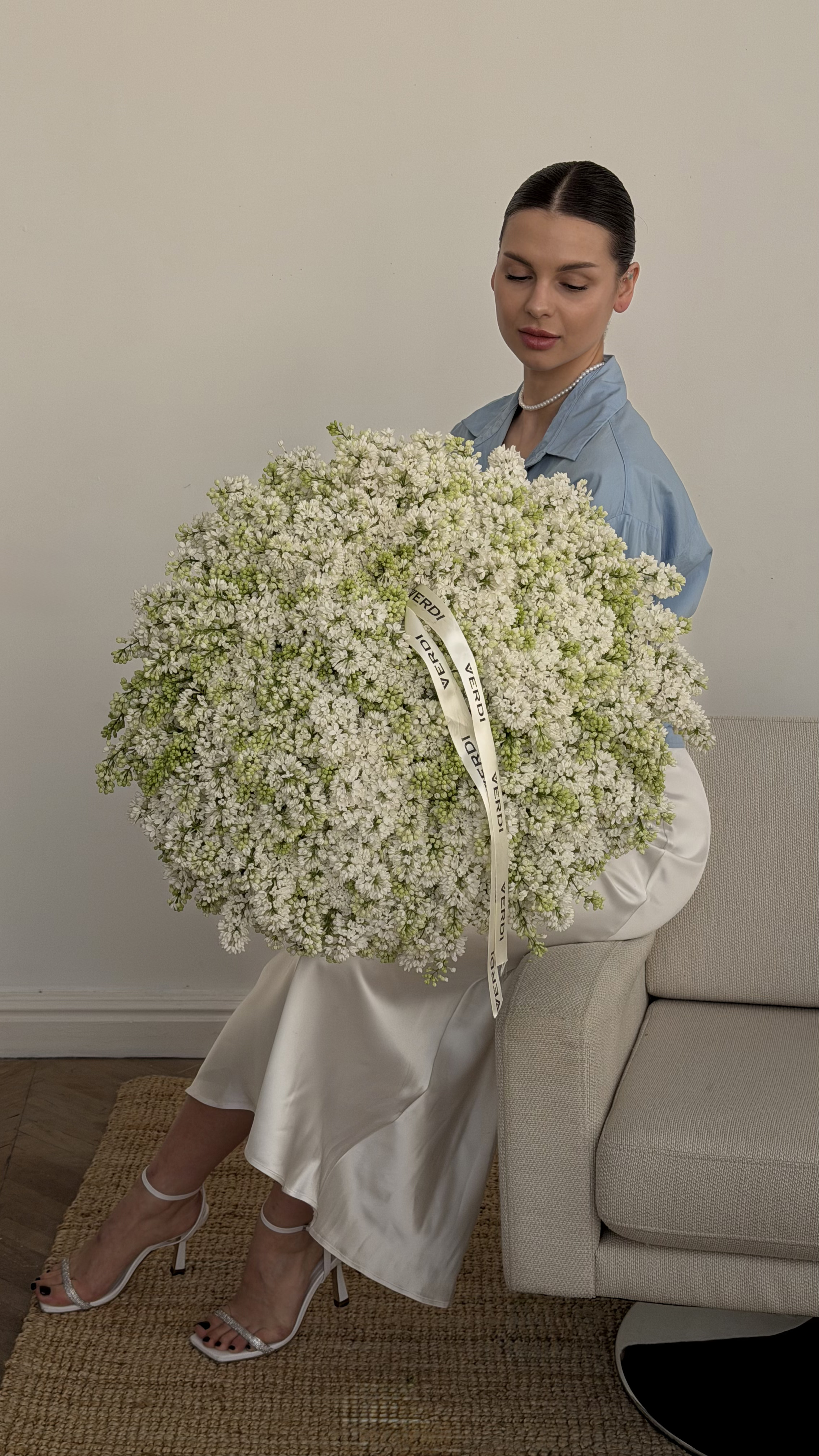 Цей грандіозний, неймовірно пишний букет складається з тисяч дрібних суцвіть свіжого білого бузку, зібраних у величезну ідеальну кулю. Його масштаб вражає, а ніжний, чистий колір символізує щирість та весняну свіжість. Композиція доповнена витонченою білою стрічкою з фірмовим написом, яка підкреслює її елітний статус. Такий розкішний об'ємний букет стане незабутнім подарунком для коханої жінки, мами або вельмишановної колеги на ювілей, весілля або як знак глибокої вдячності та поваги. Якщо ви бажаєте замовити букет, який гарантовано справить незабутнє враження та наповнить простір чудовим ароматом, цей варіант просто створений для вас. Наша професійна доставка квітів забезпечить обережне вручення цієї величної композиції.