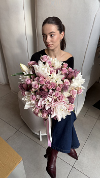 Вишуканий та об’ємний букет, що поєднує в собі благородні білі лілії та велику кількість ніжних рожевих кущових троянд. Особливої текстури та витонченості композиції надають суцвіття скімії та темні декоративні акценти, що створюють ефектний контраст. Букет зібраний у вільній, повітряній формі, що дозволяє кожній квітці розкритися у всій красі.