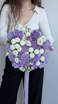 Цей ніжний та водночас об'ємний букет зачаровує своєю пастельною гамою. Основу композиції складають пишні бузкові гвоздики (діантуси) та акуратні білі хризантеми кулястої форми. Витончені акценти білої еустоми та дрібні суцвіття статиці додають букету особливої легкості та завершеності. Така вишукана композиція стане чудовим подарунком для дівчини, подруги або сестри. Це ідеальний вибір, щоб привітати з днем народження або просто підняти настрій близькій людині. Якщо ви хочете купити квіти, які поєднують у собі сучасний стиль та ніжність, цей варіант створений для вас. Наші свіжі квіти довго милуватимуть око, а швидка доставка квітів допоможе організувати сюрприз у потрібний момент.