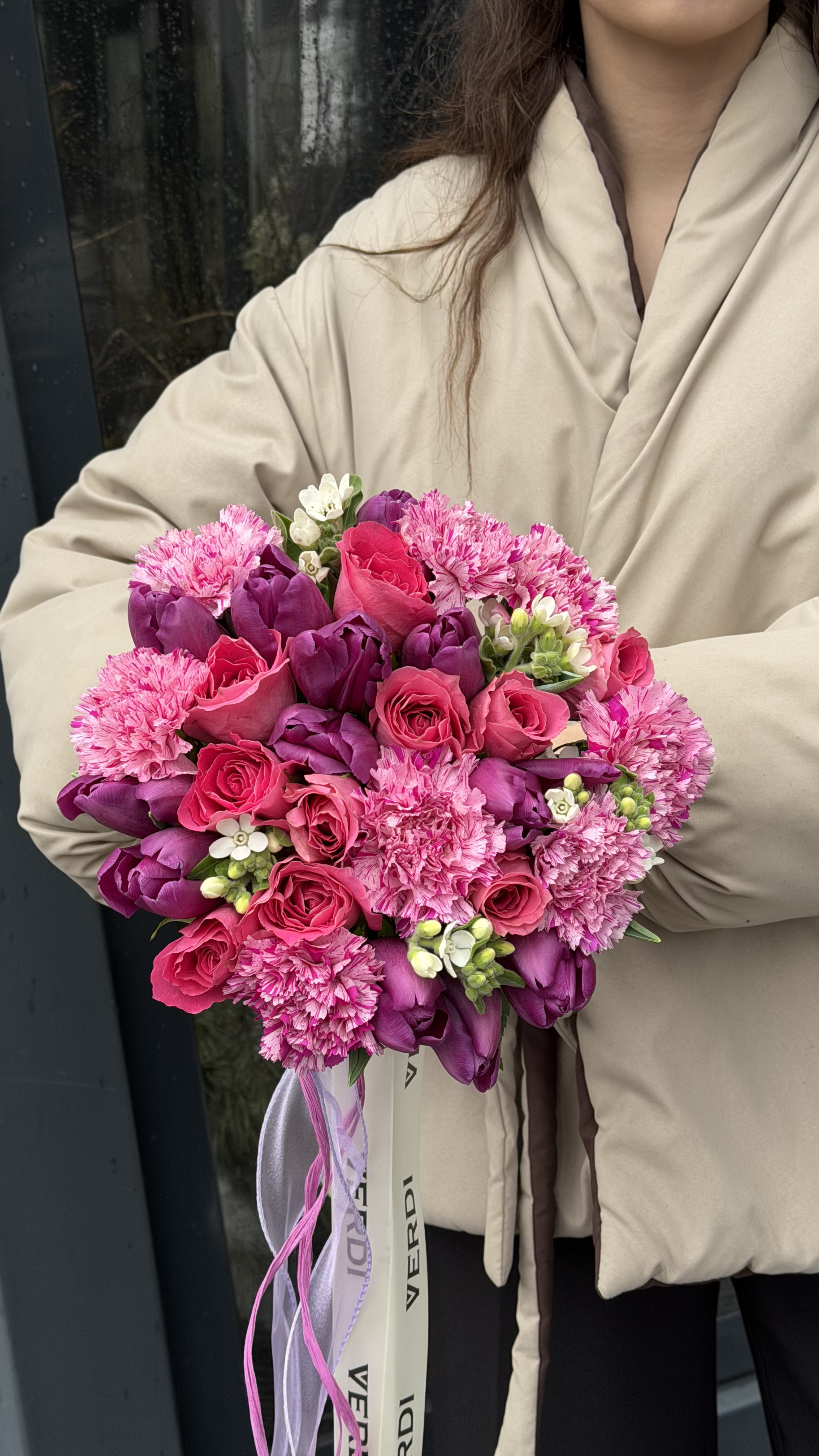 Цей компактний, але надзвичайно насичений за кольором букет вражає своєю глибиною та контрастністю. У композиції гармонійно поєдналися класичні малинові троянди, таємничі фіолетові тюльпани та пишні сортові гвоздики з витонченим візерунком на пелюстках. Білі суцвіття матіоли додають букету ніжності та приємного весняного аромату. Така яскрава композиція стане ідеальним подарунком для енергійної дівчини, подруги або колеги, щоб підкреслити їхню індивідуальність на день народження чи інше свято. Якщо ви плануєте купити квіти, які будуть виглядати стильно та сучасно, цей варіант підійде ідеально. Наша доставка квітів завжди до ваших послуг, щоб ви могли замовити букет і отримати найсвіжіші квіти з доставкою до дверей.