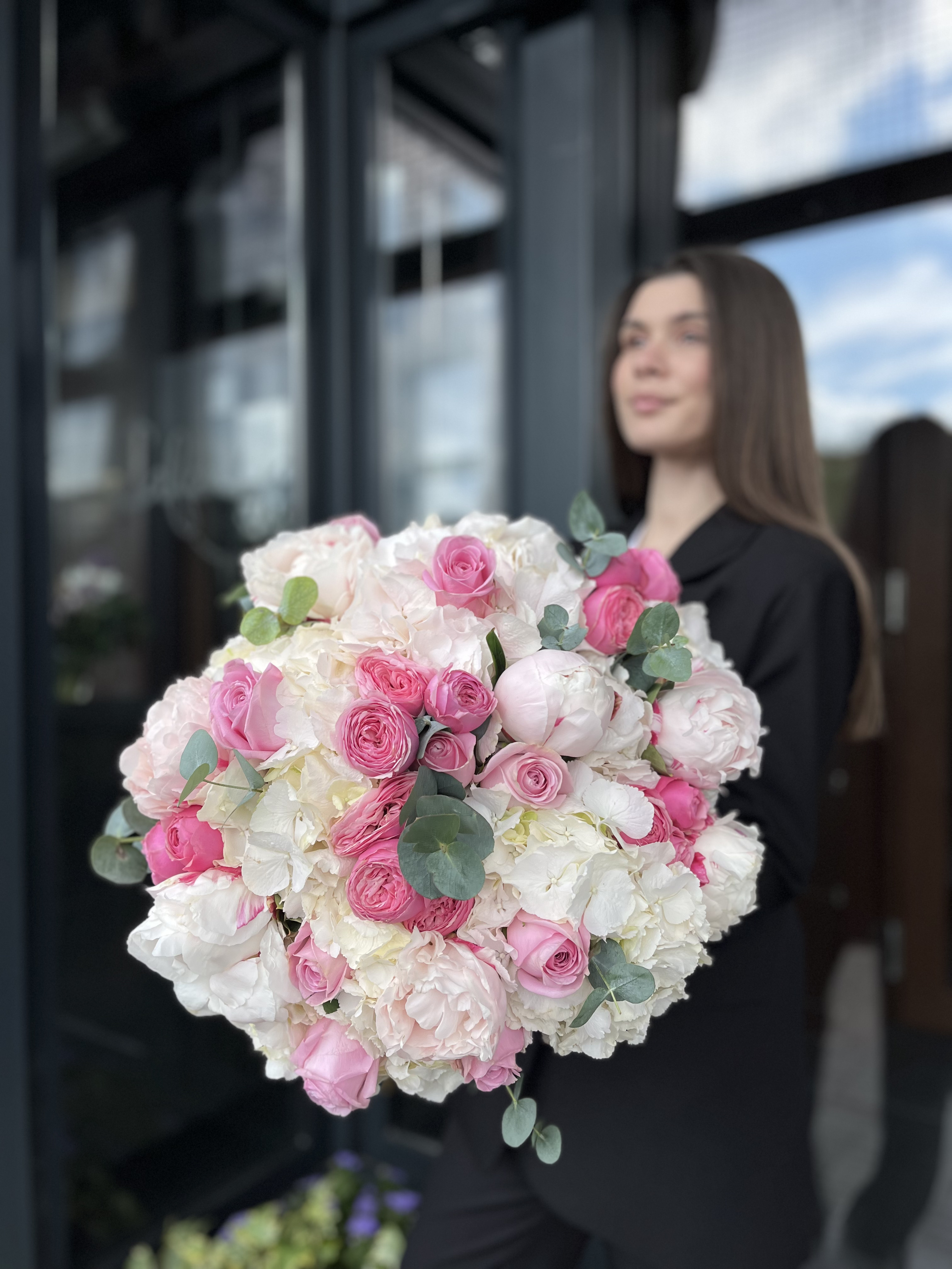 Ідеальний вибір для особливих моментів!Ніжна композиція з пишних півоній, кущових троянд та гортензій. Для зручності та захисту квітів під час доставки використовуємо коробку для транспортування, також додаємо підживку для довшого зберігання букету. Доставка по Луцьку та області.