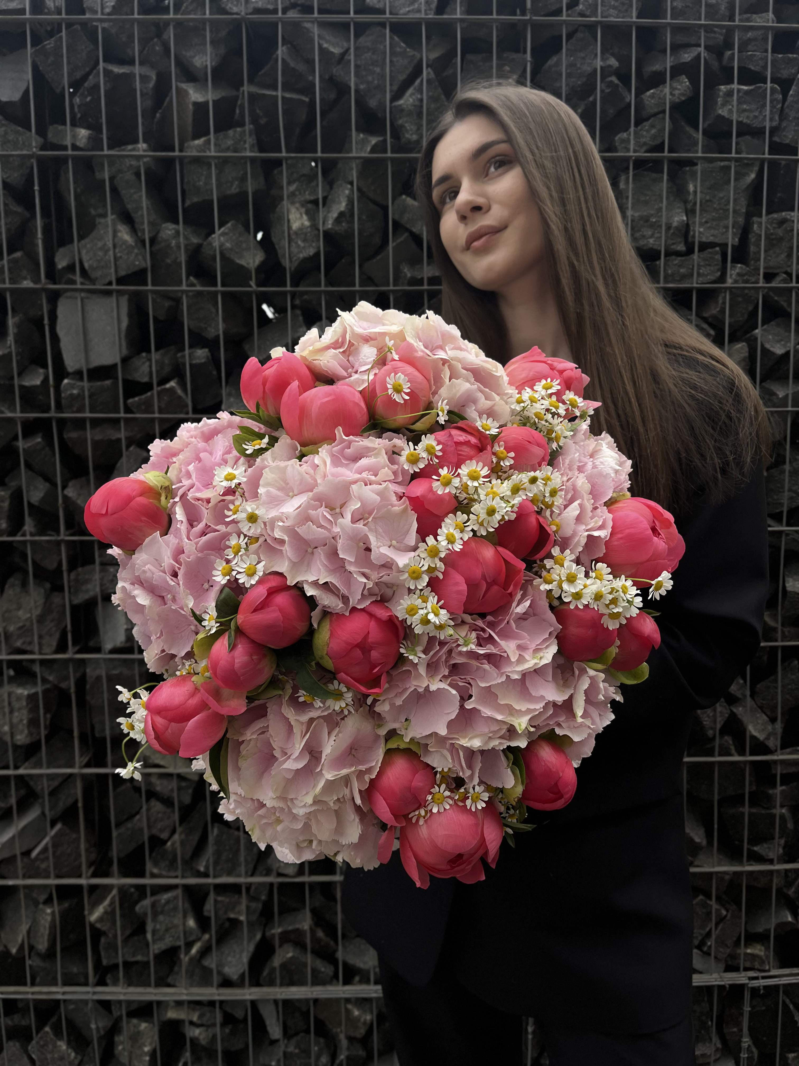 Витончений букет з гортензій, півоній та танацетуму - ідеальний вибір для створення романтичного настрою! Для зручності та захисту квітів під час доставки використовуємо коробку для транспортування, також додаємо підживку для довшого зберігання букету. Доставка по Луцьку та області.